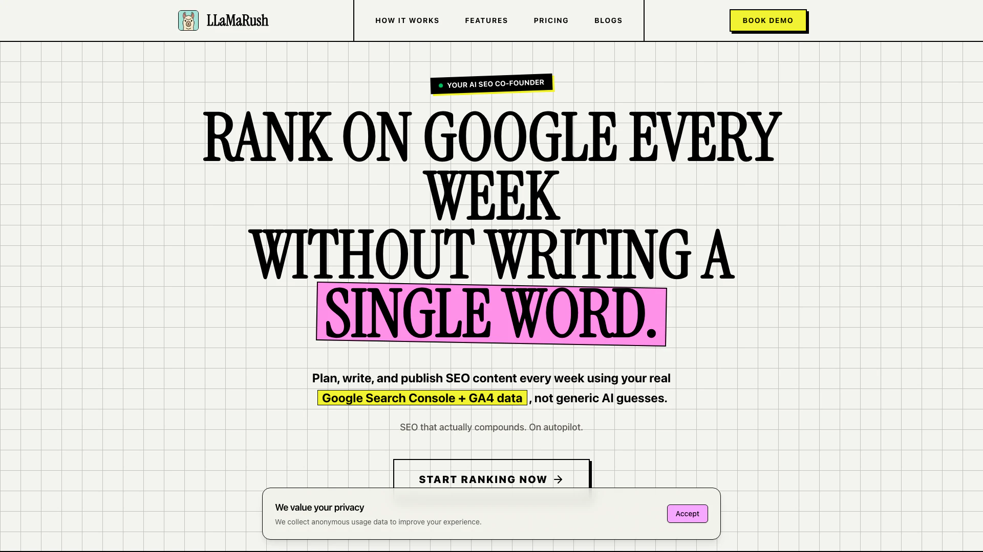 - Phân tích dữ liệu: Để LlamaRush phân tích dữ liệu trang web của bạn để tạo ra một kế hoạch SEO tùy chỉnh dựa trên các chỉ số thực thay vì giả định chung.