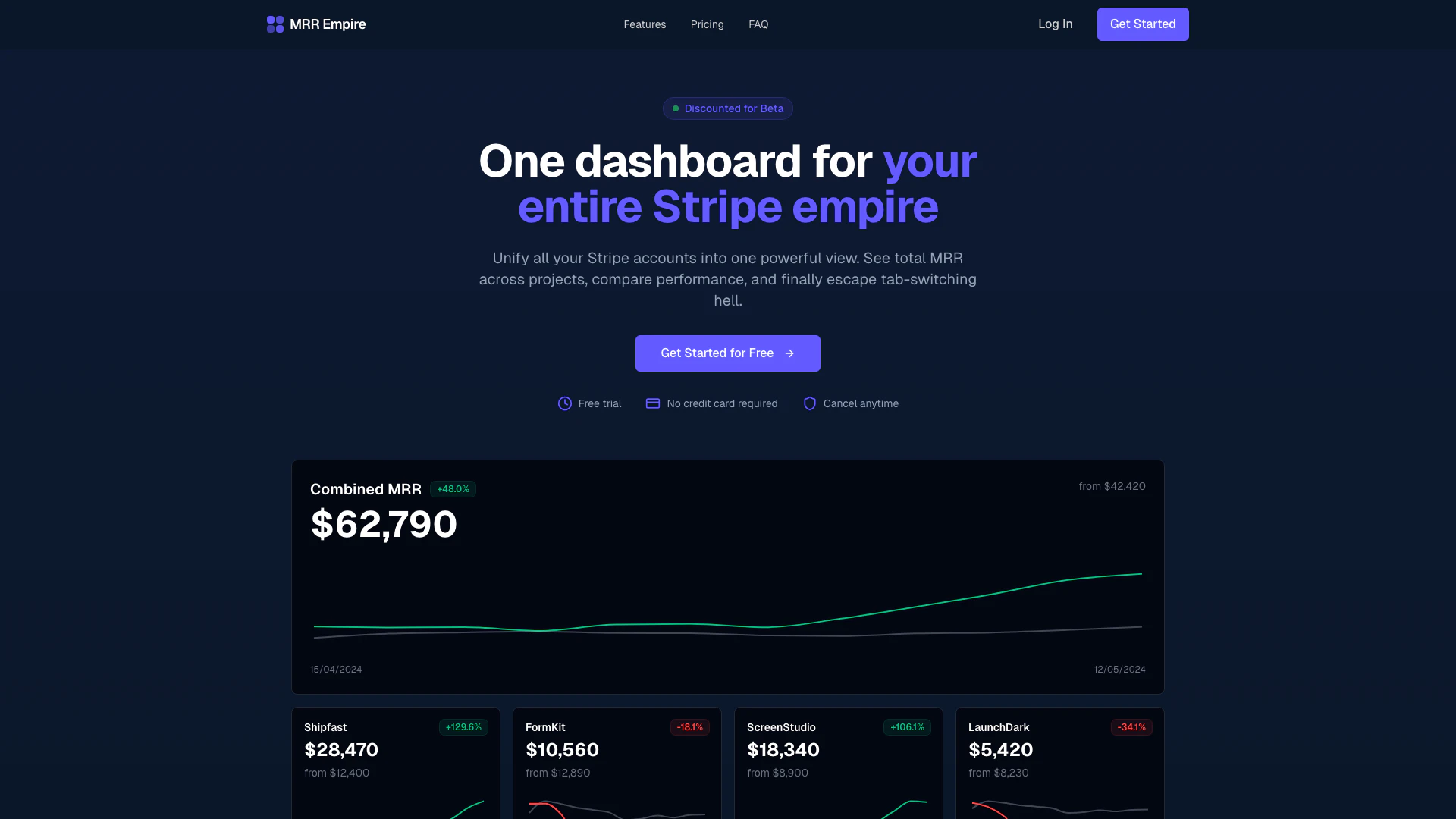 Mrrempire là một công cụ bảng điều khiển mạnh mẽ được thiết kế để thống nhất nhiều tài khoản Stripe thành một cái nhìn tổng quát. Nó cho phép người dùng, đặc biệt là các nhà sáng lập SaaS và doanh nhân, theo dõi Doanh thu Định kỳ Hàng tháng (MRR) qua nhiều dự án, so sánh các chỉ số hiệu suất và có được sự rõ ràng về danh mục đầu tư mà không cần chuyển đổi giữa các bảng điều khiển Stripe khác nhau. Công cụ này giải quyết những thách thức mà người dùng gặp phải khi quản lý nhiều nguồn doanh thu bằng cách cung cấp một nền tảng tập trung cho phân tích tài chính và ra quyết định.