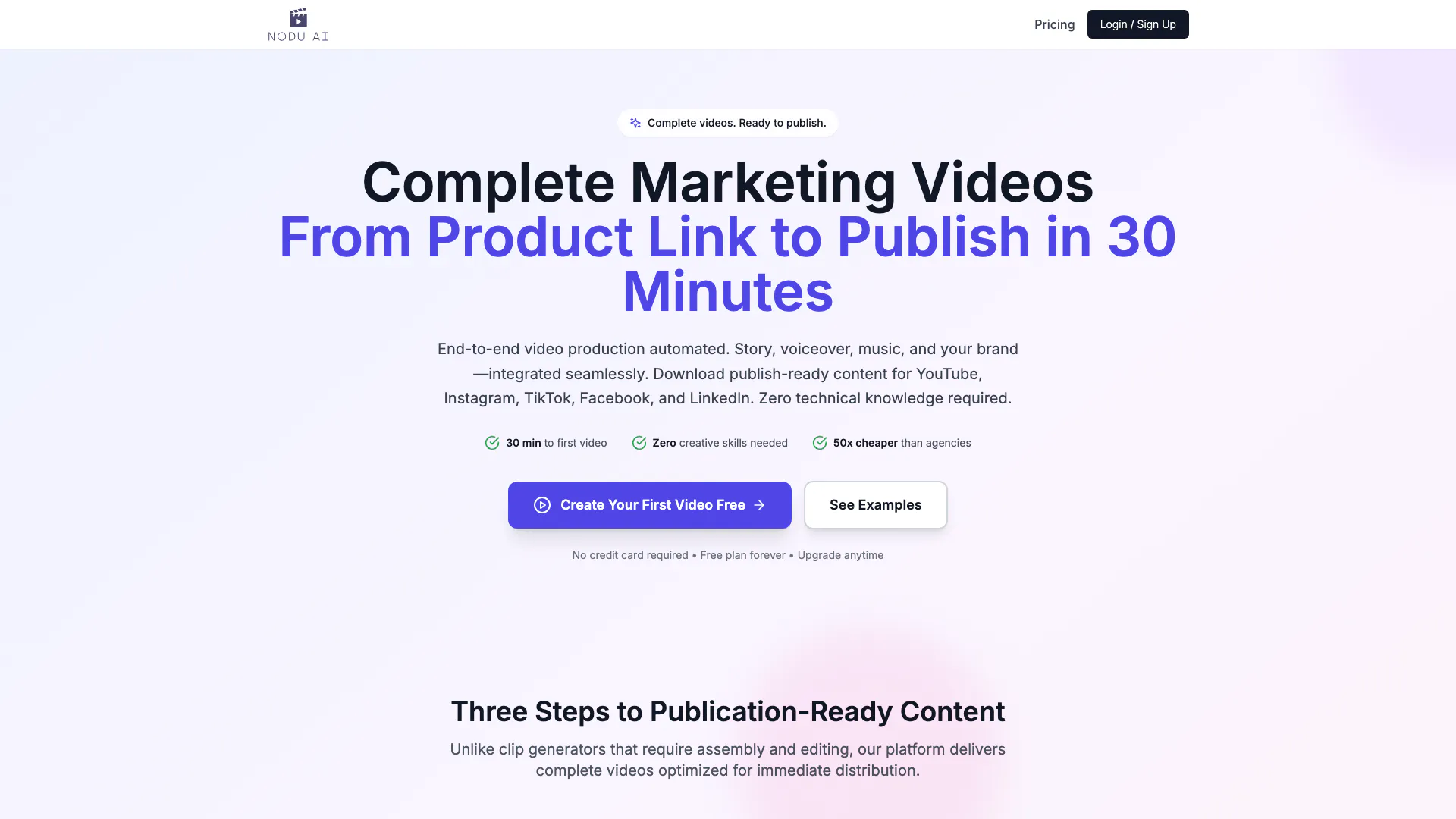 Nodu là một nền tảng biến bất kỳ URL sản phẩm nào thành một chiến dịch video hoàn chỉnh, sẵn sàng xuất bản chỉ trong 30 phút, bao gồm kịch bản, lồng ghép giọng nói, nhạc và tài sản thương hiệu.