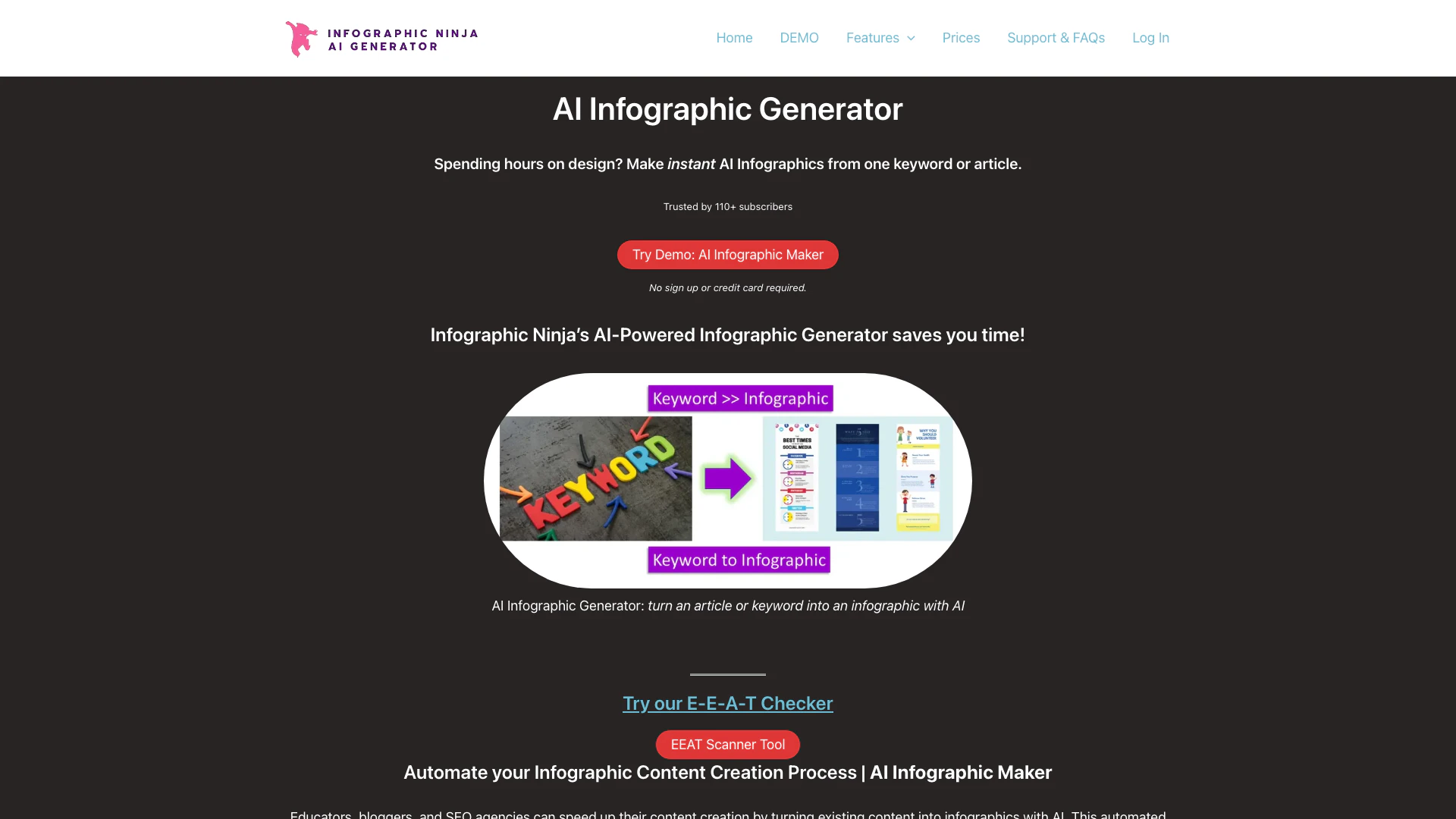 Outline Ninja là một công cụ tạo infographic sáng tạo được hỗ trợ bởi AI, cho phép người dùng tạo ra các infographic hấp dẫn chỉ trong 30 giây. Công cụ độc đáo này biến đổi văn bản, dù chỉ là một từ khóa hay một bài viết đầy đủ, thành các infographic bắt mắt bằng công nghệ trí tuệ nhân tạo tiên tiến. Được thiết kế để tiết kiệm thời gian và dễ sử dụng, Outline Ninja loại bỏ quy trình thiết kế thủ công tẻ nhạt, cho phép người dùng tập trung vào việc tạo nội dung và kể chuyện.