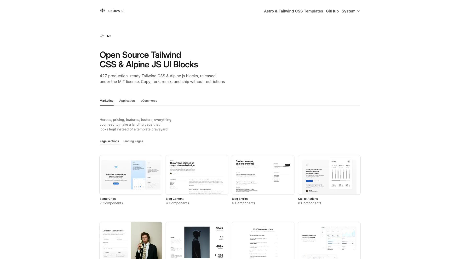 - Các Thành Phần Sẵn Sàng Sản Xuất: Oxbowui cung cấp 427 khối Tailwind CSS và Alpine.js sẵn sàng sản xuất, cho phép người dùng nhanh chóng triển khai các yếu tố UI mà không cần bắt đầu từ đầu.