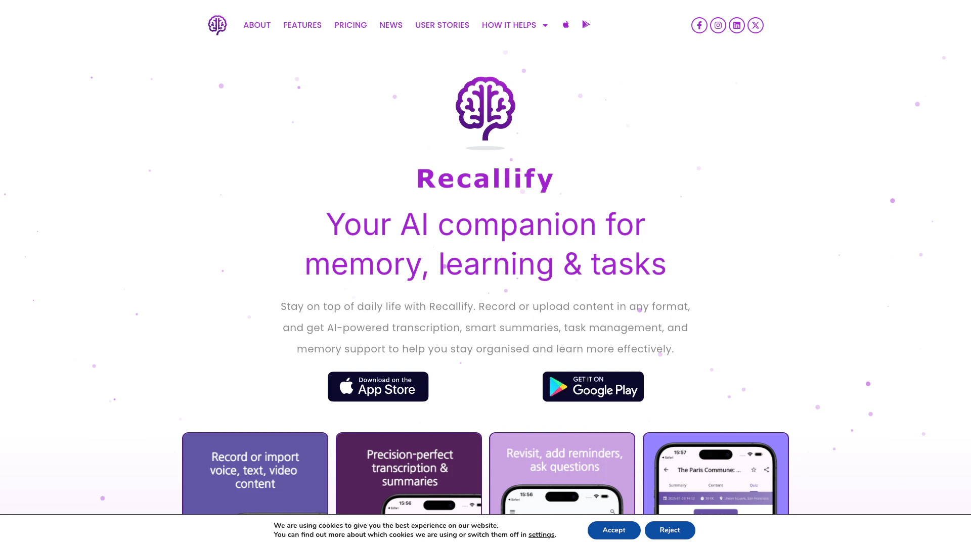 Recallifyai là một ứng dụng năng suất AI sáng tạo được thiết kế để nâng cao hỗ trợ trí nhớ, học tập và quản lý công việc. Công cụ đa năng này cho phép người dùng ghi lại các cuộc trò chuyện, bài giảng hoặc ghi chú cá nhân, sau đó nó sẽ chuyển đổi và tổ chức thành các nhiệm vụ có thể thực hiện và tóm tắt ngắn gọn. Với các tính năng được điều chỉnh cho những người có ADHD và các thách thức về nhận thức khác, Recallifyai nhằm đơn giản hóa tổ chức hàng ngày và cải thiện khả năng ghi nhớ thông tin, trở thành một người bạn đồng hành vô giá cho sinh viên, chuyên gia và bất kỳ ai muốn tăng cường năng suất của mình.