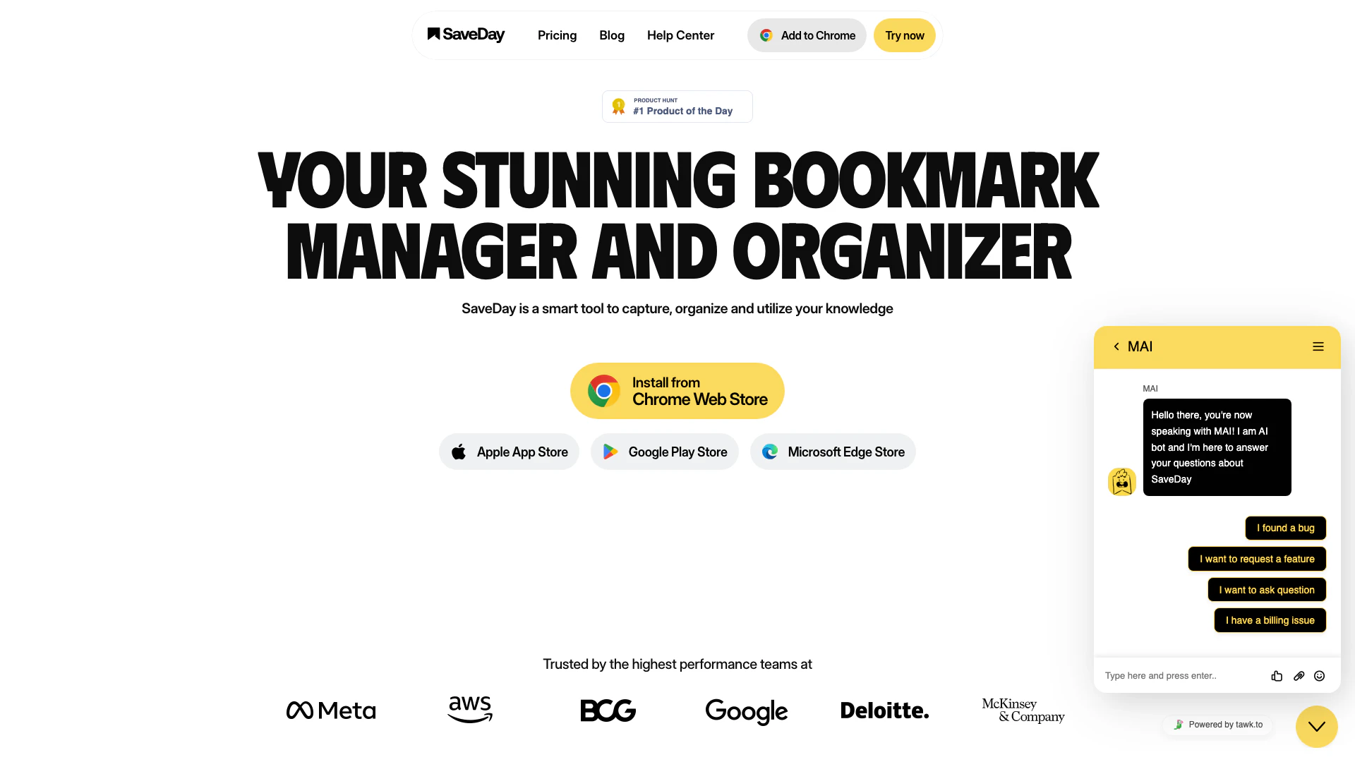 SaveDay là một công cụ thông minh được thiết kế để ghi lại, tổ chức và sử dụng kiến thức của bạn một cách hiệu quả. Nó hoạt động như một trình quản lý dấu trang mạnh mẽ cho phép người dùng lưu và quản lý thông tin từ internet một cách liền mạch. Chỉ với một cú nhấp chuột, người dùng có thể ghi lại mọi thứ họ thấy hữu ích trực tuyến, loại bỏ sự phiền phức của việc tổ chức nội dung thủ công. Giá trị cốt lõi của SaveDay nằm ở khả năng đơn giản hóa việc quản lý kiến thức, giúp người dùng dễ dàng truy cập và sử dụng thông tin đã lưu khi cần.