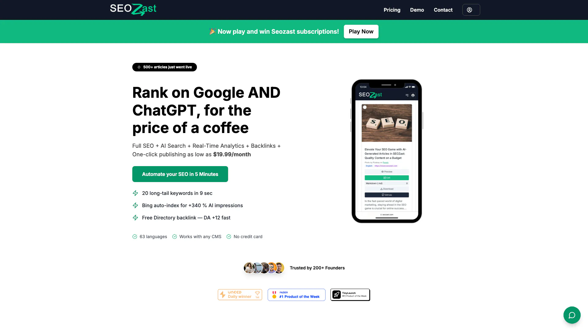 Seozast là một công cụ SEO sáng tạo được thiết kế để tự động hóa SEO và tối ưu hóa tìm kiếm AI chỉ trong vòng năm phút. Với mức phí đăng ký 19,99 đô la mỗi tháng, người dùng có thể tận dụng các tính năng mạnh mẽ như tạo từ khóa đuôi dài, liên kết ngược tích hợp, xuất bản chỉ bằng một cú nhấp chuột và phân tích thời gian thực. Seozast được thiết kế cho những người muốn nâng cao khả năng hiển thị trực tuyến trên cả Google và các nền tảng AI như ChatGPT, cung cấp một giải pháp tiết kiệm chi phí cho tiếp thị kỹ thuật số hiệu quả.