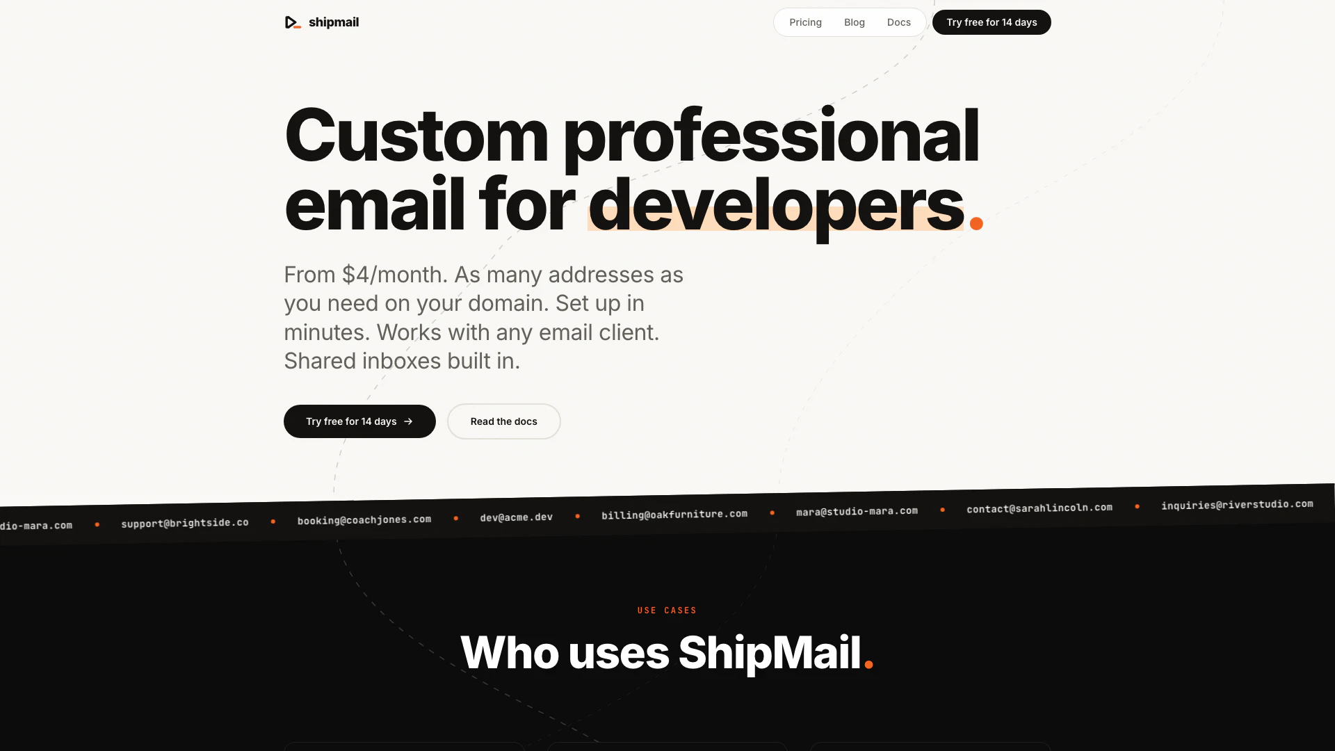 - Các nhà sáng tạo và thương hiệu cá nhân có thể sử dụng Shipmail để tạo ra các địa chỉ email độc đáo phản ánh danh tính thương hiệu của họ, chẳng hạn như mara@studio-mara.com.