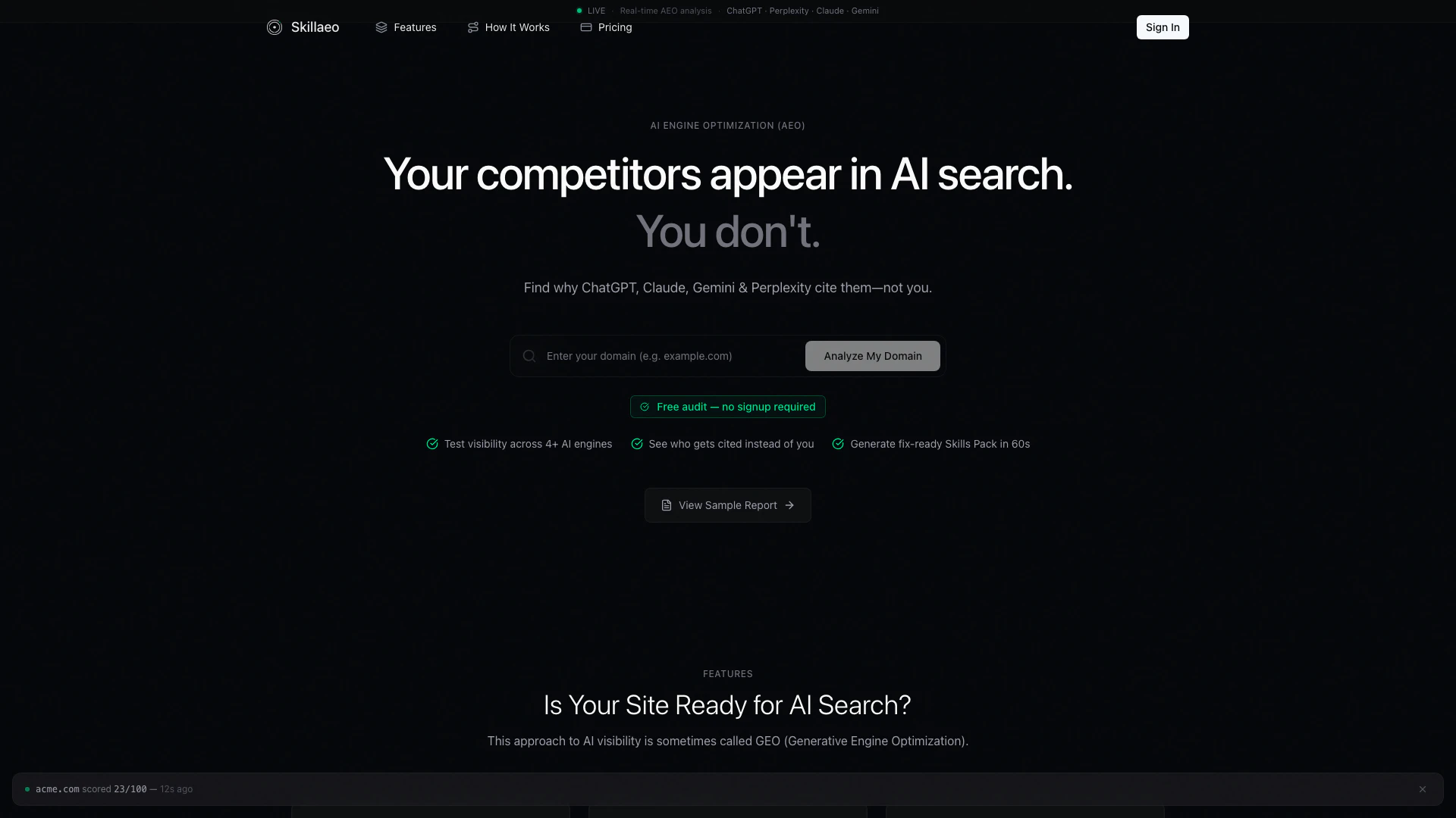 - Chạy kiểm tra Evidence + AI: Skillaeo sẽ thực hiện một cuộc kiểm tra chi tiết cấu trúc trang web của bạn và kiểm tra khả năng hiển thị của nó trên nhiều động cơ AI khác nhau bao gồm ChatGPT, Perplexity và Claude.