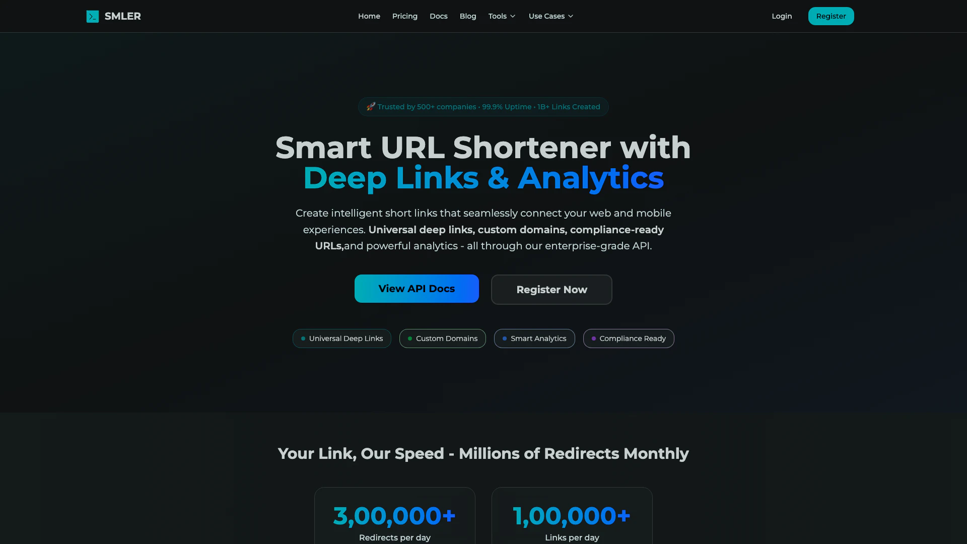 Smler là một API rút gọn URL chuyên nghiệp được thiết kế để nâng cao nỗ lực tiếp thị kỹ thuật số bằng cách cung cấp liên kết sâu, tên miền tùy chỉnh, liên kết thương hiệu và phân tích nâng cao. Với cơ sở hạ tầng mạnh mẽ, Smler hỗ trợ hàng triệu lần chuyển hướng hàng tháng, trở thành giải pháp đáng tin cậy cho hơn 500 công ty trên toàn thế giới. Công cụ này cho phép người dùng tạo liên kết ngắn sẵn sàng tuân thủ quy định với quy mô lớn, đảm bảo trải nghiệm người dùng liền mạch trên các nền tảng di động và web.