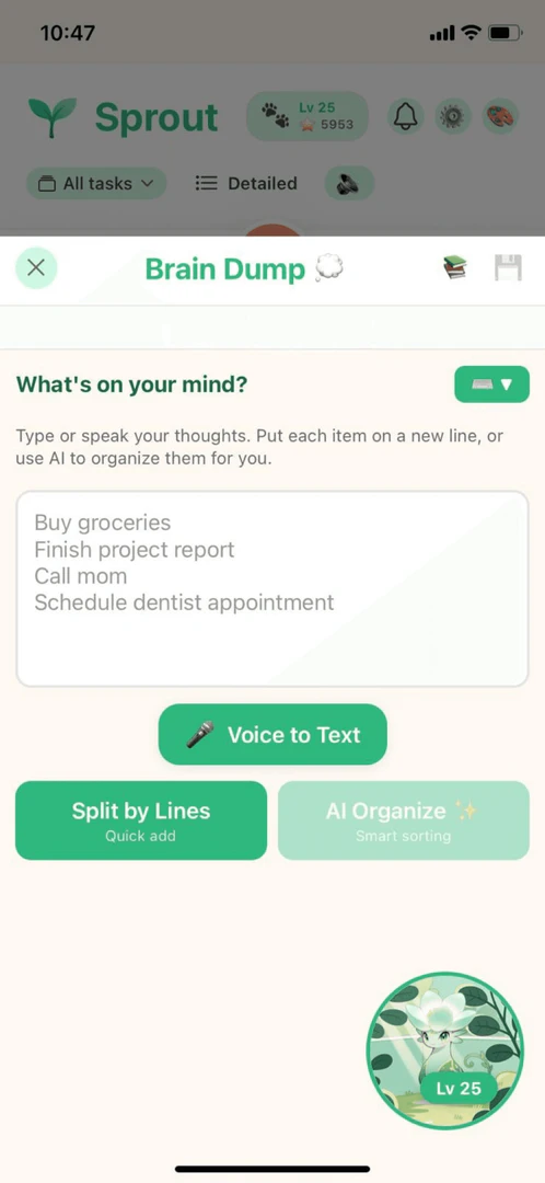 - Thêm những gì bạn đang nghĩ: Bắt đầu bằng cách sử dụng tính năng Brain Dump để gõ hoặc ghi âm giọng nói những suy nghĩ của bạn. Sproutapp sẽ tổ chức chúng thành các nhiệm vụ có thể hành động cho bạn.