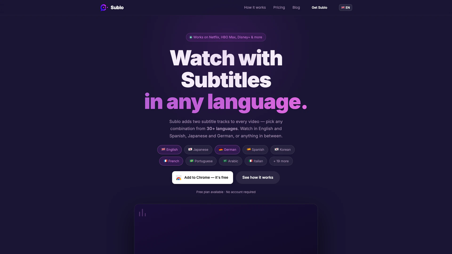 Sublo hoạt động trên Netflix, HBO Max, Disney+, Amazon Prime Video, Crunchyroll, YouTube, Apple TV+, Peacock, Paramount+, Hulu, MUBI và Plex — với nhiều dịch vụ được thêm vào thường xuyên.