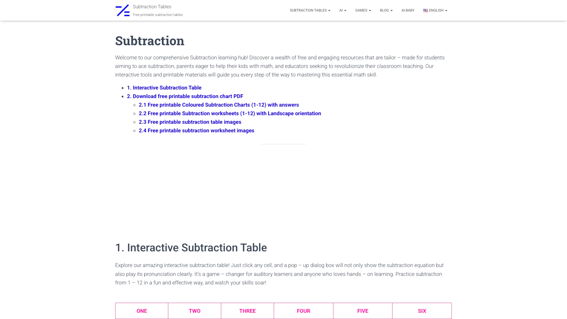 - Truy cập trang web Subtractiontables tại https://subtractiontables.com/.