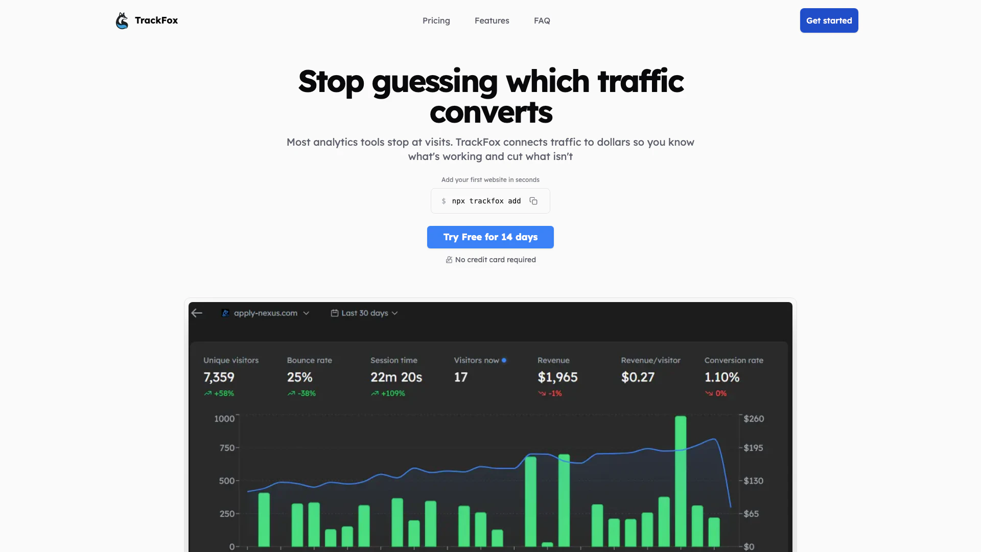 TrackFox cung cấp ba tính năng mạnh mẽ: Phân tích Web & Doanh thu để theo dõi lưu lượng truy cập trang web của bạn và xem tiền đến từ đâu; Phân tích theo Giờ để có cái nhìn chi tiết về lưu lượng truy cập theo giờ nhằm hiểu rõ các đỉnh điểm và mô hình tương tác; và Phân tích Chuyển đổi để lọc ra các lượt truy cập đã xác thực và đo lường tỷ lệ chuyển đổi thực sự của trang đích của bạn.