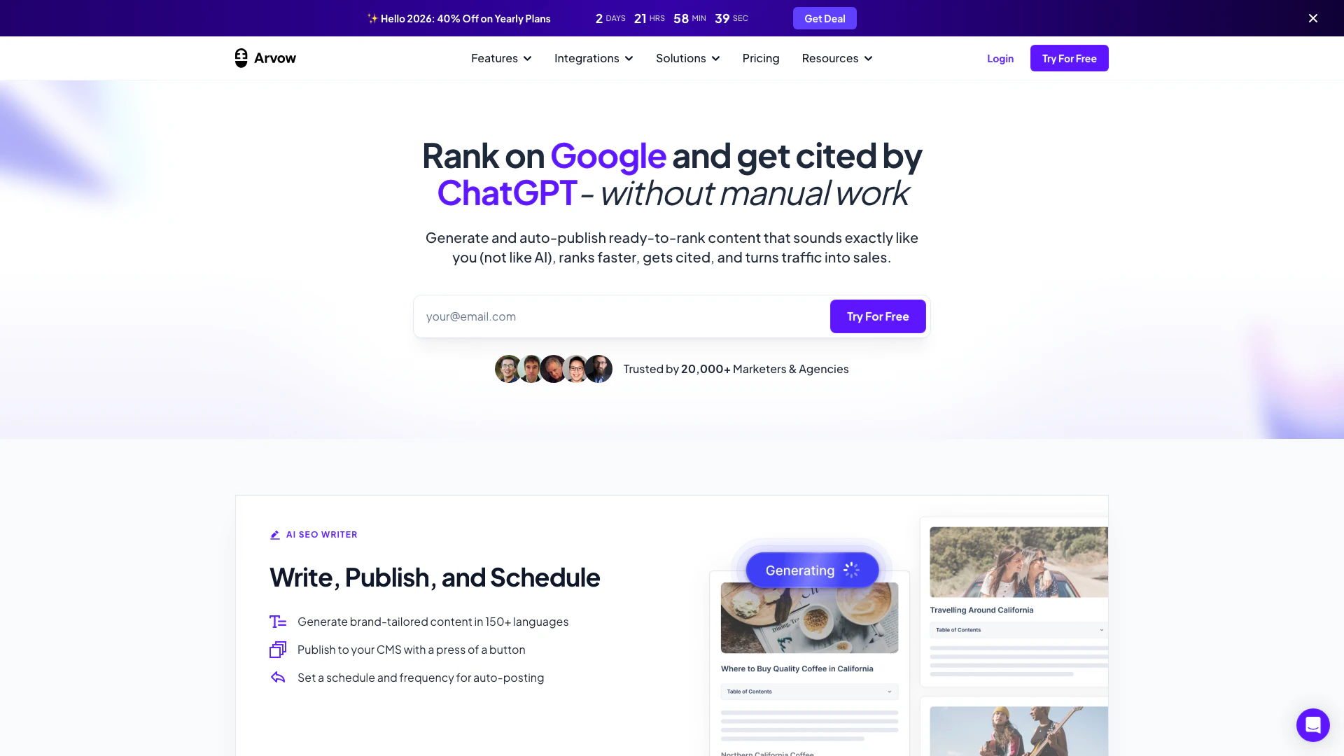1.000 tín dụng mỗi tháng Blog tự động không giới hạn Tối ưu hóa trang web Liên kết nội bộ và bên ngoài Kết nối với Web Tất cả các tích hợp Hơn 150 ngôn ngữ được hỗ trợ Hình ảnh nổi bật và trong bài viết Video Youtube Nghiên cứu từ khóa tự động