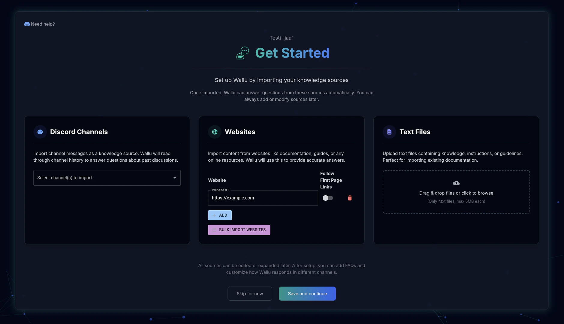 Wallu là một chatbot có thể tùy chỉnh được thiết kế để tự động hóa hỗ trợ khách hàng trên máy chủ Discord của bạn. Nó có thể trả lời các câu hỏi của người dùng dựa trên các nguồn kiến thức của bạn và cung cấp hỗ trợ như một nhân viên 24/7.