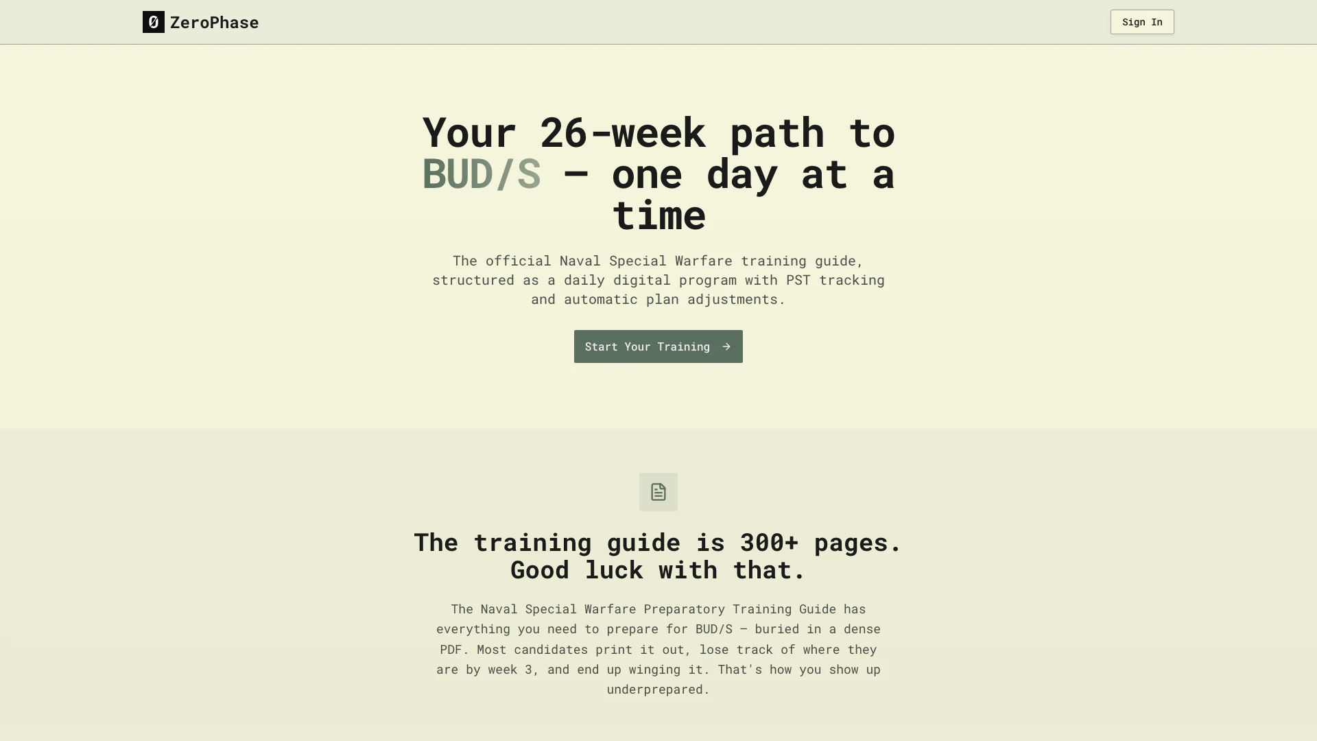 Zerophase là một chương trình đào tạo kỹ thuật số toàn diện được thiết kế đặc biệt cho những cá nhân chuẩn bị cho khóa đào tạo Nhảy dù/SEAL (BUD/S) của Hải quân. Công cụ này biến hướng dẫn đào tạo PDF truyền thống dày đặc thành một kế hoạch hành động tương tác hàng ngày kéo dài 26 tuần. Nó có tính năng theo dõi thể lực cá nhân, điều chỉnh kế hoạch tự động dựa trên hiệu suất và các bài tập được cấu trúc hướng dẫn người dùng qua các bài tập cardio, sức mạnh và calisthenics. Bằng cách đơn giản hóa quy trình đào tạo, Zerophase đảm bảo rằng các ứng viên luôn tập trung và đi đúng hướng, tối đa hóa cơ hội thành công của họ trong BUD/S.