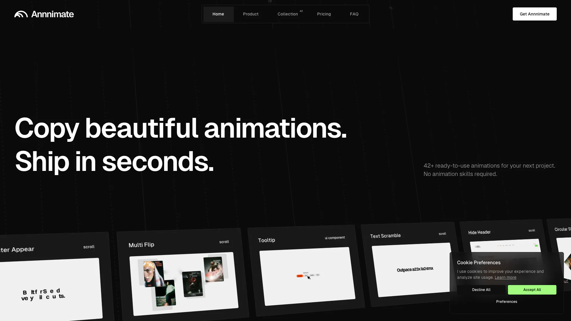 Annnimate is a tool that provides 42+ ready-to-use GSAP animations for HTML, React, and Webflow, allowing developers to copy and paste professional animations into their projects quickly.
