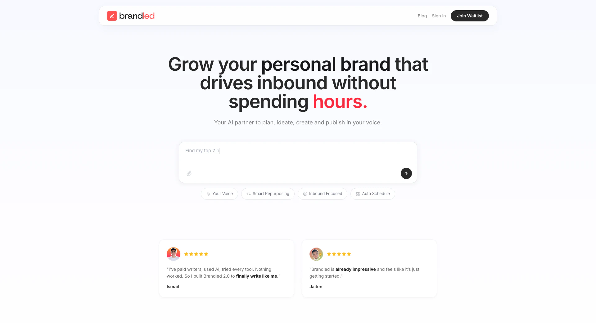 Brandled 旨在为多种用户设计,包括创始人、独立创业者,以及任何希望提升个人品牌的人。无论您是刚刚起步还是在内容创作方面有经验,Brandled 提供必要的工具,以有效地传达您的信息并吸引入站机会。对于那些可能之前没有持续发帖但渴望建立在线存在感的个人尤其有用。