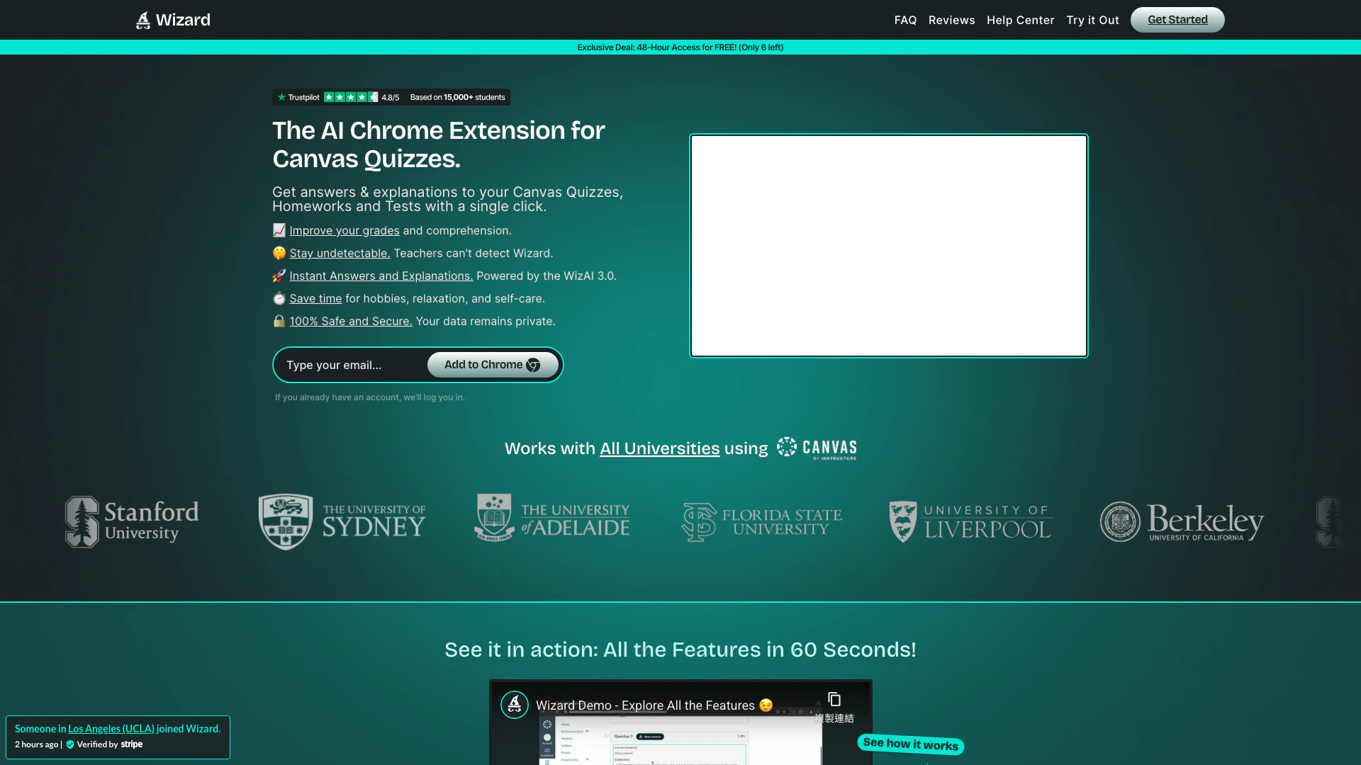 Wizard AI Chrome扩展与Canvas LMS集成,在测验页面添加“显示答案”按钮。点击后,Wizard利用先进的人工智能分析测验问题,并实时提供准确的答案和解释。