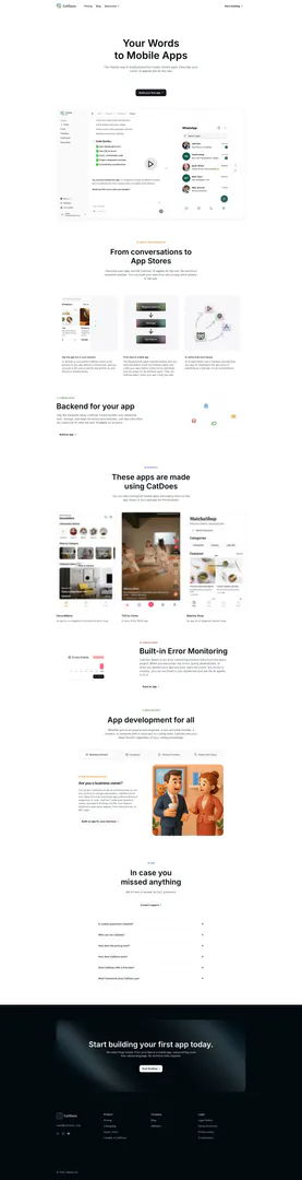 CatDoes旨在服务于广泛的用户,包括希望创建功能性应用的企业主、希望将原型变为现实的UI/UX设计师、需要快速开发市场准备产品的初创公司创始人,以及缺乏技术技能的应用想法持有者。该平台使任何人都能将他们的愿景变为现实,无论他们的技术背景如何。