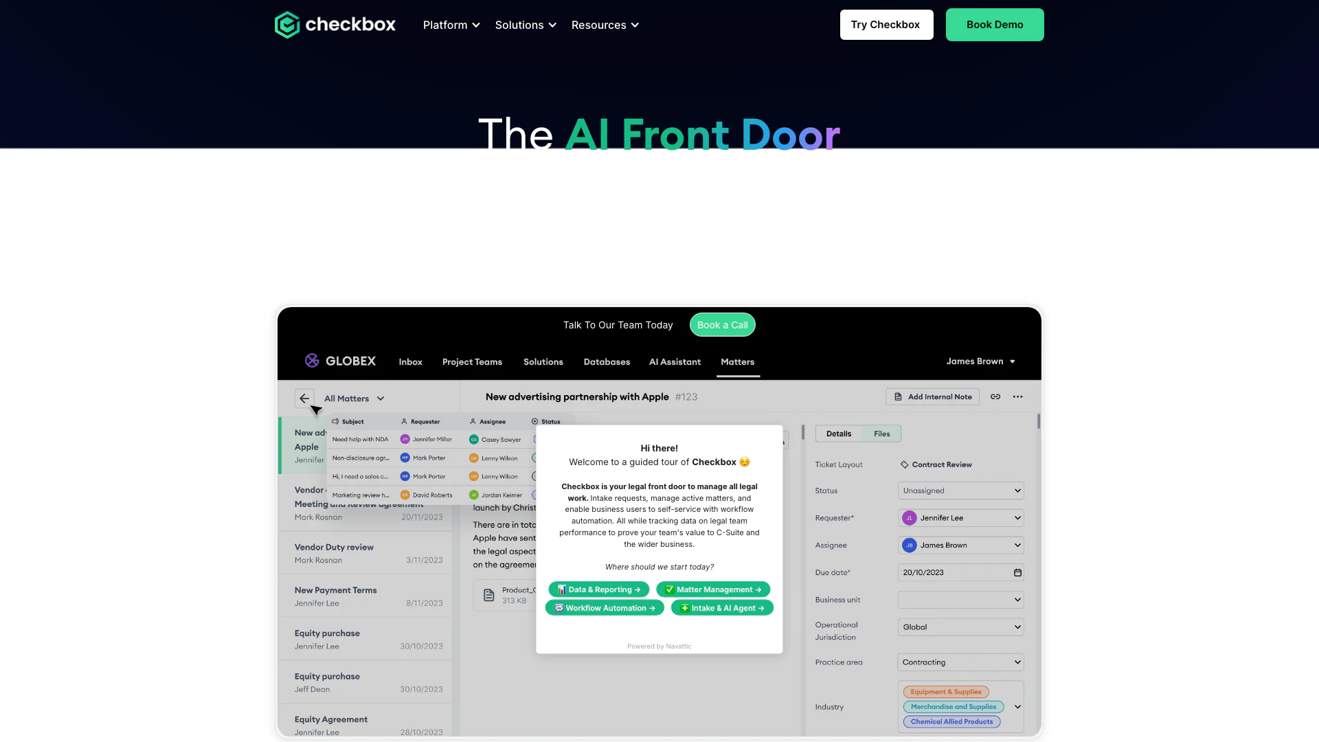 - 增强的报告和分析: Checkbox提供仪表板和分析功能,使法律团队能够有效跟踪绩效指标、工作负载分配和周期时间。
