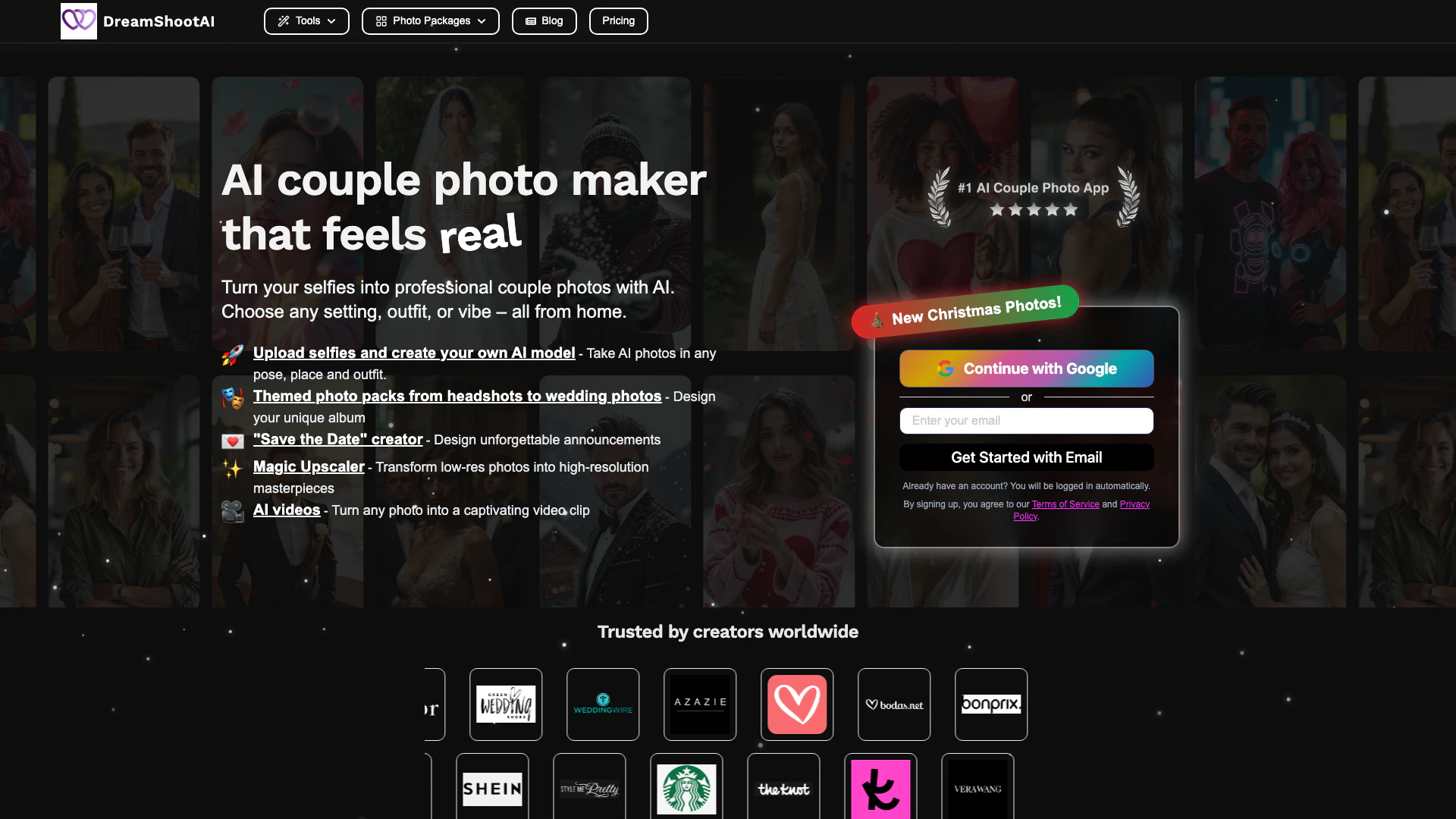 DreamShootAI 旨在为任何希望轻松创建令人惊叹的情侣照片的人而设计。它特别适合计划婚礼或订婚的情侣、寻求专业头像的个人以及希望为假期或活动捕捉特殊时刻的人。此外,它还满足需要独特和引人注目的社交媒体图像的内容创作者和影响者的需求。凭借其多样化的主题照片包,DreamShootAI 吸引了广泛的受众,包括那些欣赏 AI 生成摄影便利性的人。