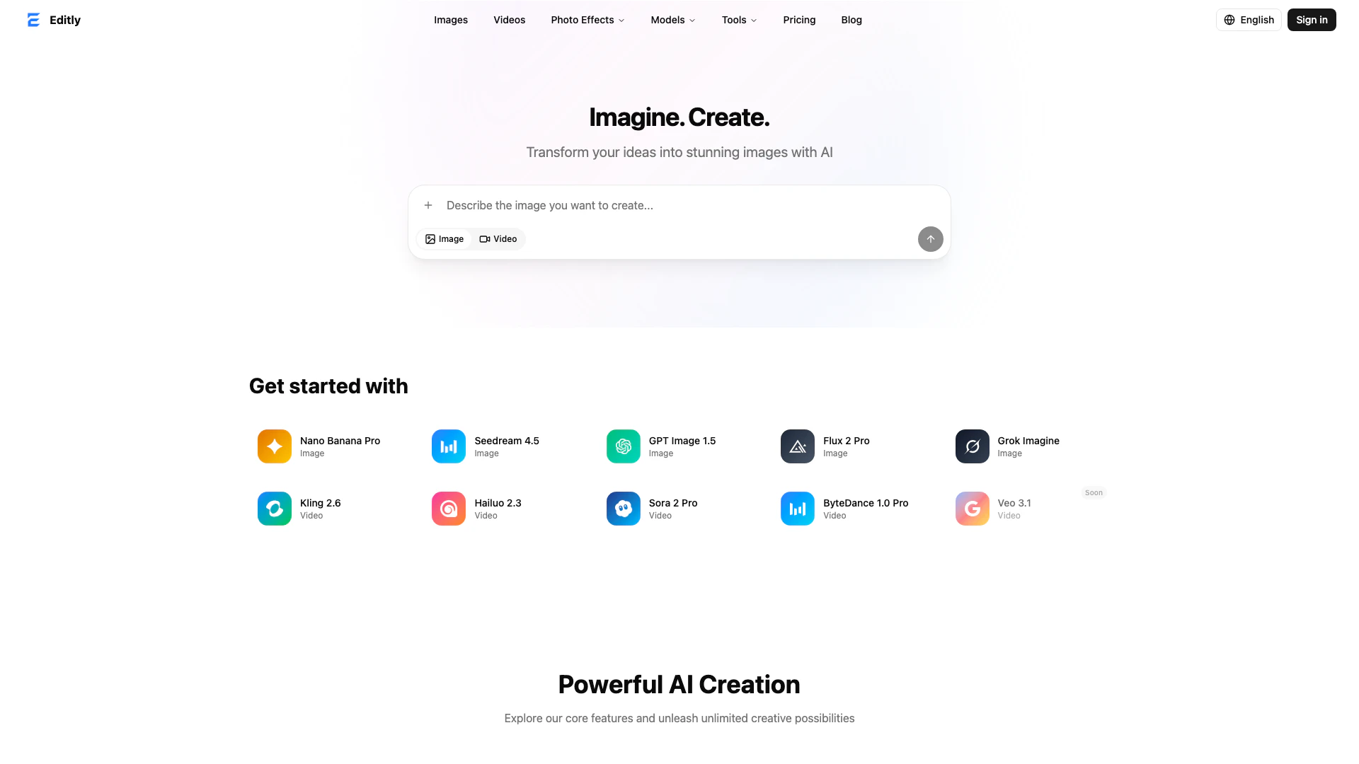 Editly 是一个全方位的 AI 创作平台,允许您使用多个 AI 模型生成图像、编辑照片和创建视频。