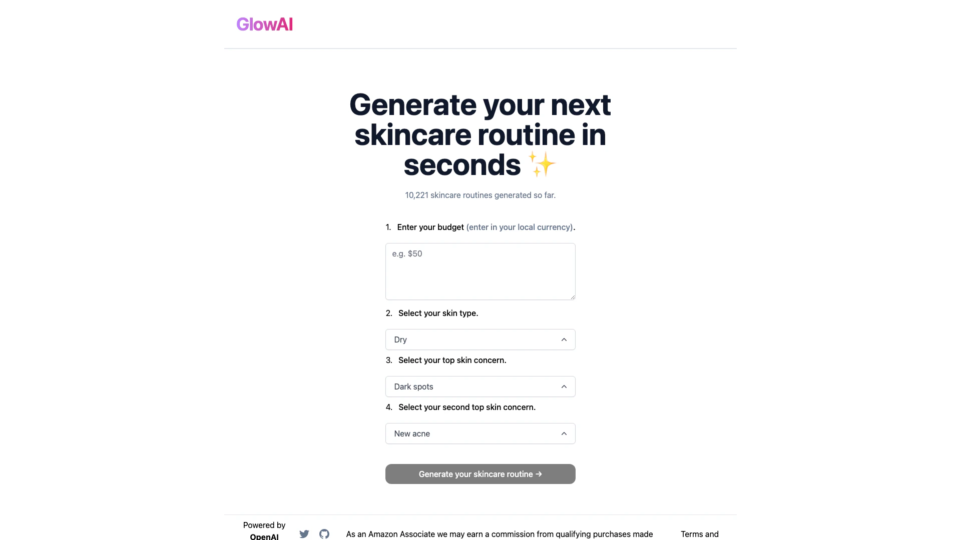 - 可定制选项: 用户可以输入预算、肤质和特定的皮肤问题,确保护肤建议量身定制。