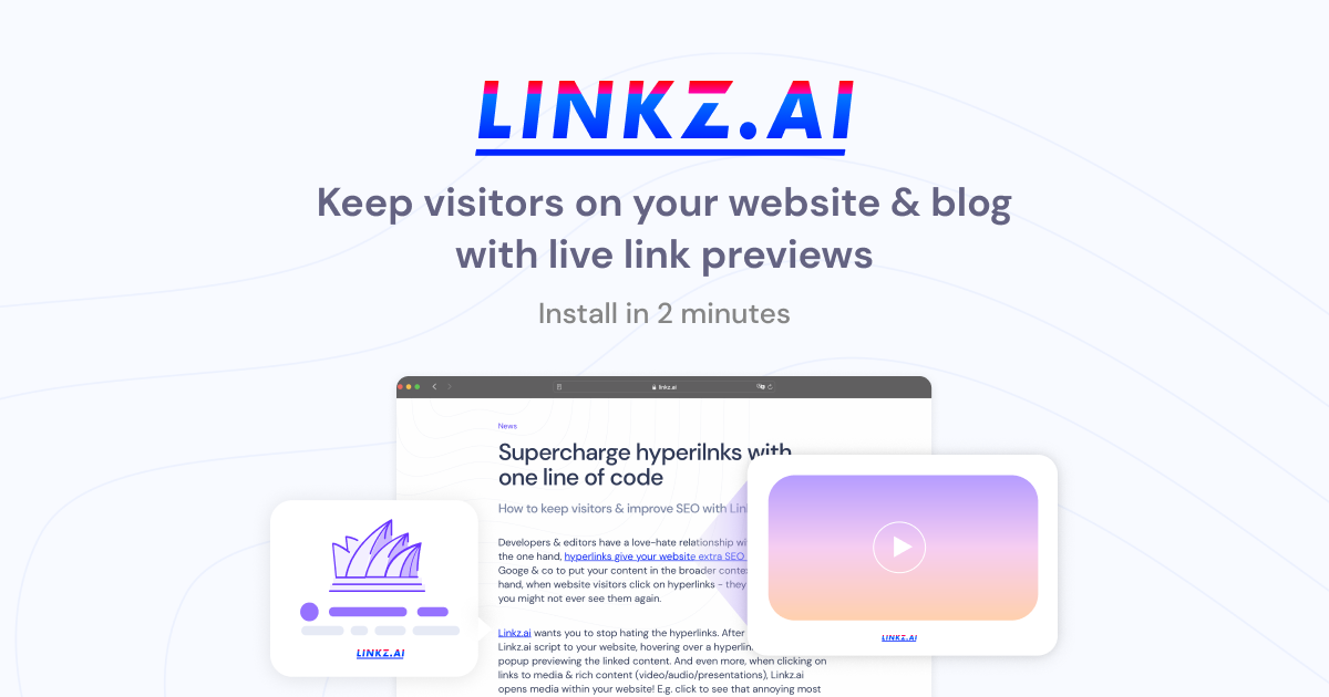 Linkz.ai 允许您将脚本添加到您的网站,从而在悬停时启用自动链接预览,在点击时启用丰富链接预览。