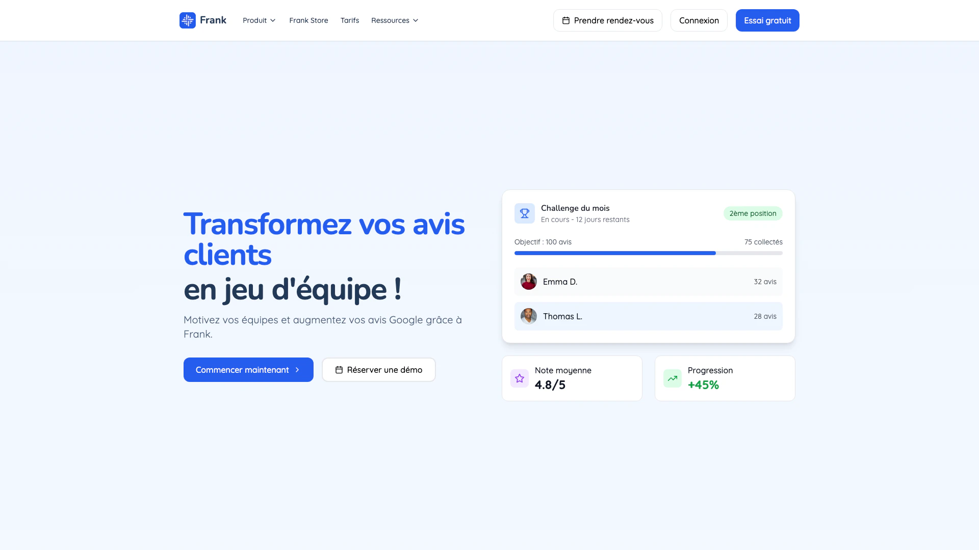 Myfrank 是一个 SaaS 平台,旨在集中客户评价,同时增强团队的积极性。它将收集评价的过程转变为团队游戏,鼓励协作并增加 Google 评价的数量。通过利用游戏化,Myfrank 帮助企业改善在线声誉和可见性,最终通过客户反馈推动增长。
