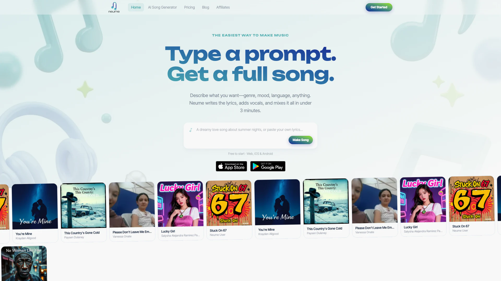- AI 生成歌曲:Neume 的 AI 将处理你的提示,创作原创歌词,作曲,添加真实的人声,并在三分钟内混合完整的曲目。