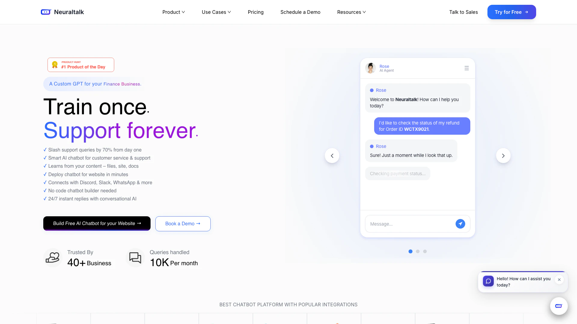 Neuraltalk为我们节省了数周的客户支持时间。我们只需上传帮助文档,立刻为用户提供24/7的准确答案。 莎拉,客户成功