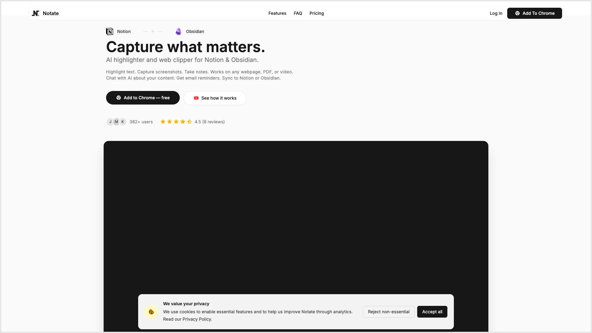 Notate 旨在为广泛的用户群体设计,包括学生、研究人员、专业人士以及任何经常与在线内容互动的人。它特别适合那些将 Notion 或 Obsidian 作为主要笔记和组织工具的人。无论您是为项目收集信息、为考试学习,还是仅仅希望跟踪来自文章和视频的有价值见解,Notate 都提供了一个全面的解决方案,以简化高亮、注释和同步内容的过程。