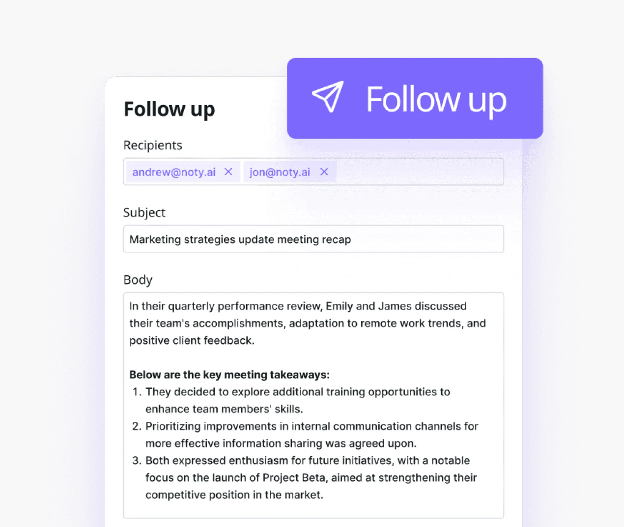 - 高效的任务管理: Noty.ai根据会议讨论生成AI驱动的待办事项列表,帮助用户有效地优先处理任务和跟踪进度。