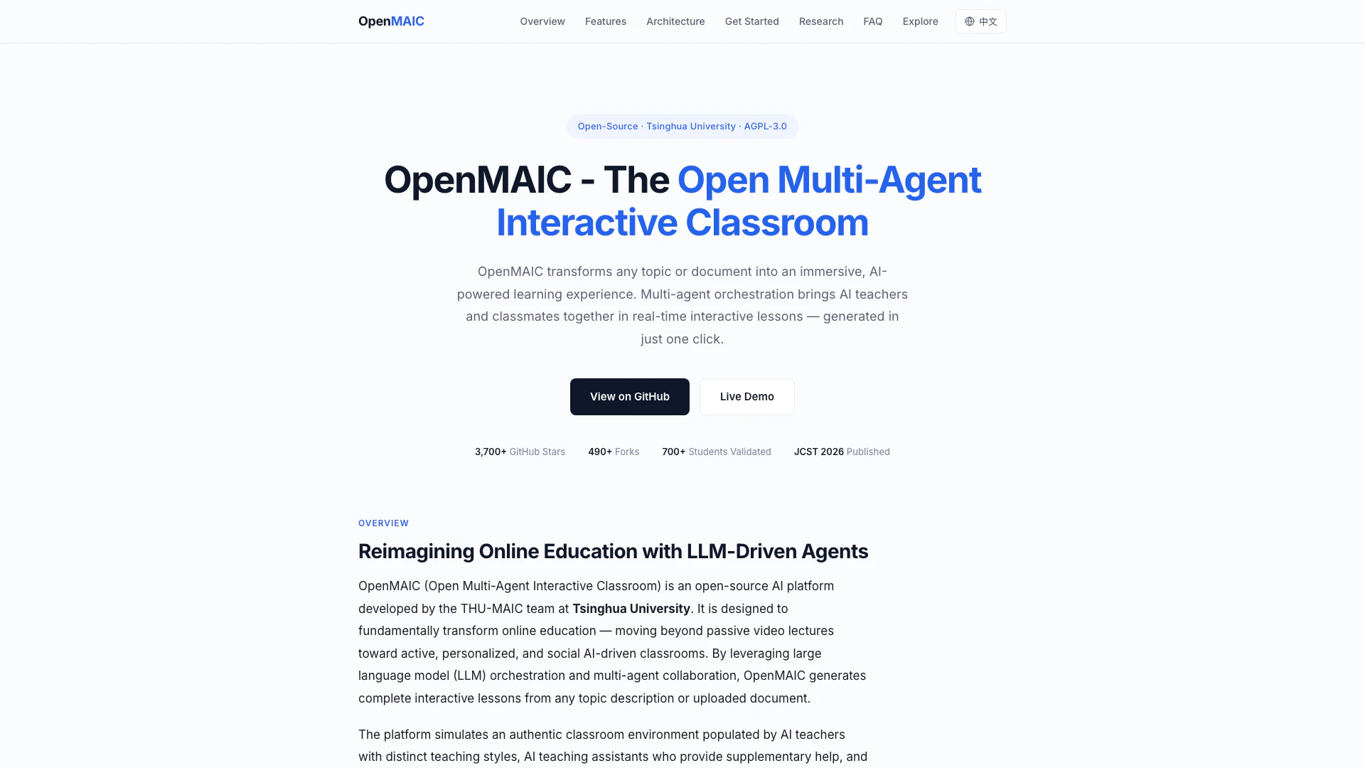 OpenMAIC(开放多智能体互动课堂)是由清华大学开发的开源AI平台,可以将任何主题或文档转化为沉浸式、互动式的课堂体验。它使用多智能体编排与基于大型语言模型的AI教师和同学,提供个性化、引人入胜的课程。