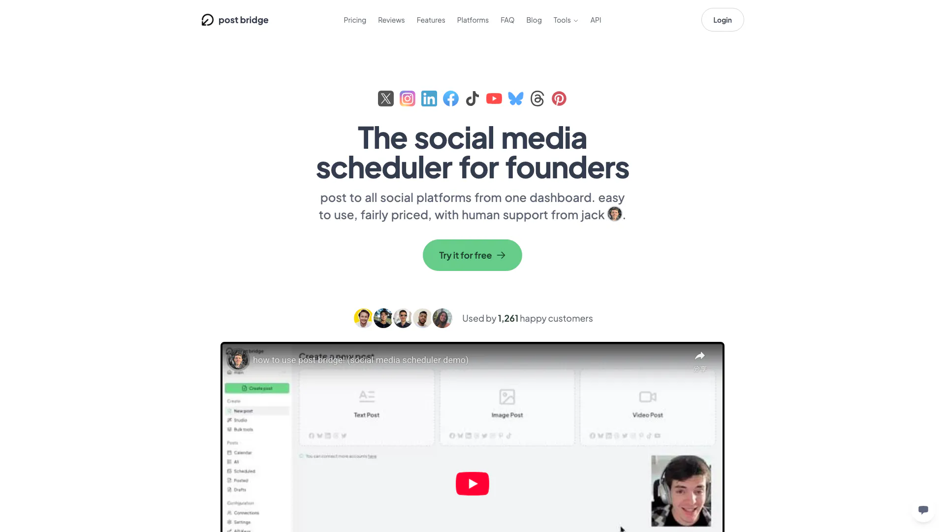 相同的核心功能,价格仅为1/10,使用起来真的简单。像Buffer和Hootsuite这样的工具每月收费75到200美元,而大多数人从未使用过这些功能。Post Bridge专注于重要的事情:快速可靠地发布到所有平台。没有臃肿的仪表板,没有你不需要的企业功能。只需连接你的账户,创建你的帖子,30秒内在所有平台上发布。此外,你还可以获得来自创始人Jack的人性化支持,而不是等待几天才能得到工单回复。