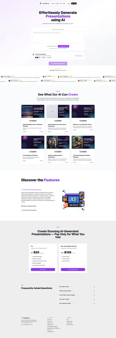 - 无限的AI驱动生成: Presentia.ai允许用户生成无限的AI驱动演示文稿,没有限制,使用户在制作各种类型的演示文稿时能够发挥创造力和灵活性。
