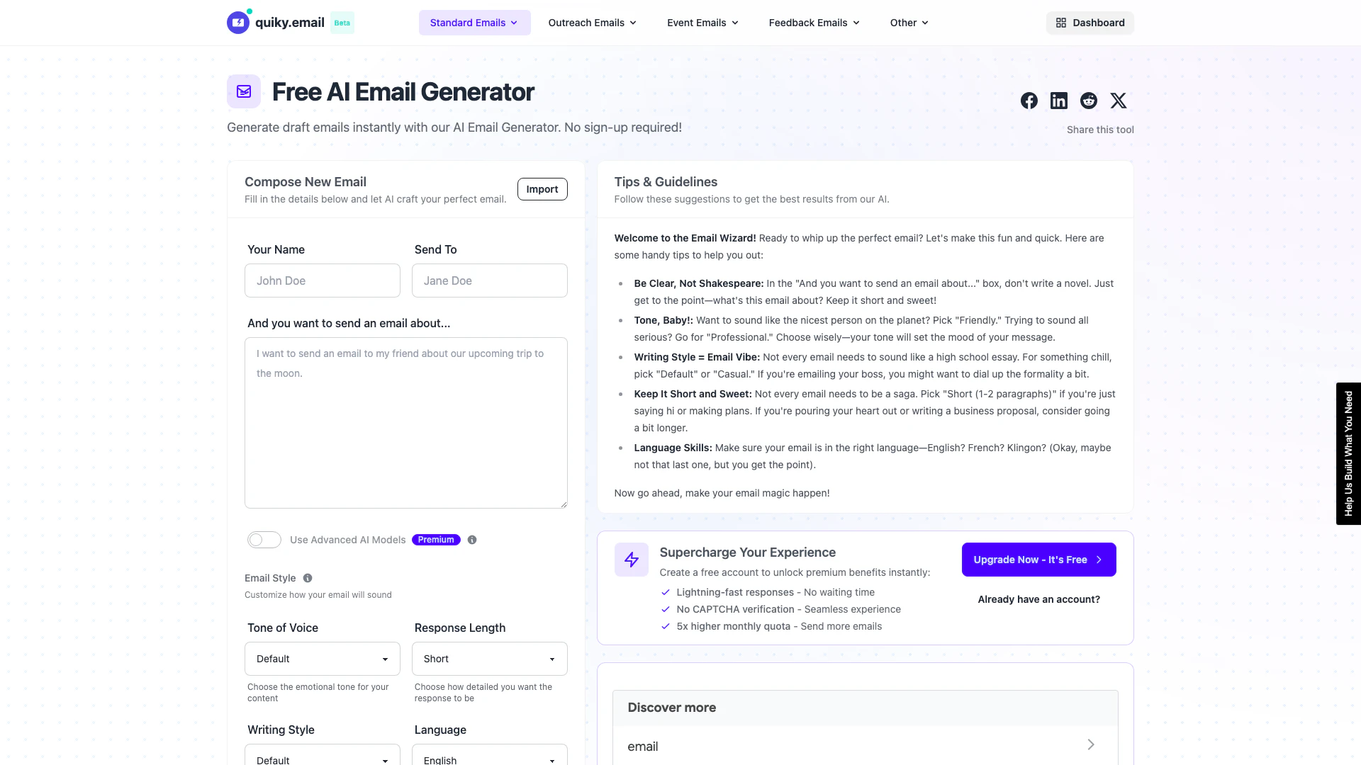 - 免费邮件写作助手: Quiky 提供一个免费的 AI 邮件生成器,帮助用户快速撰写邮件,无需注册,使其对任何人都可访问。