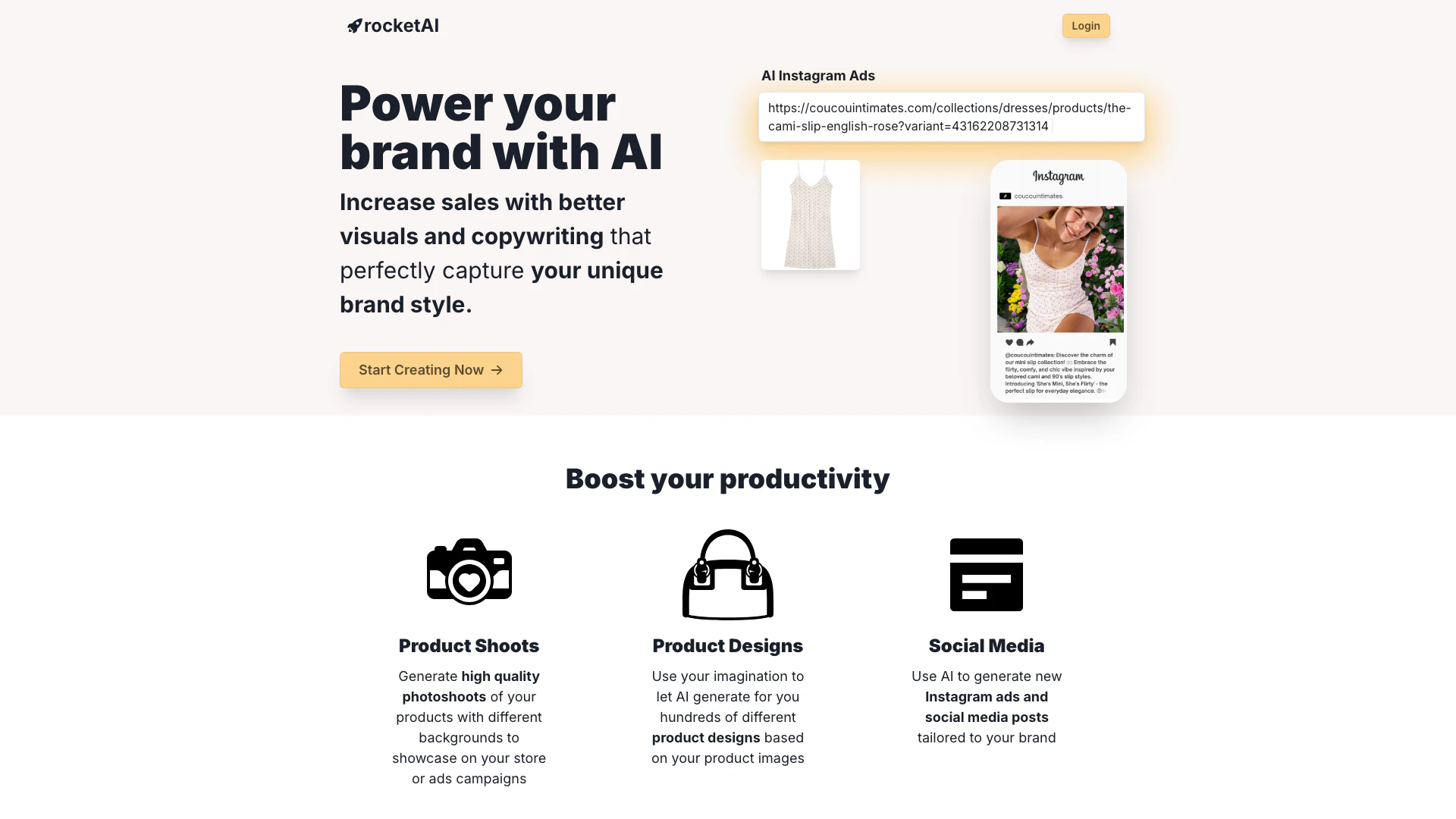Rocketai 提供了一系列强大的功能,旨在增强您的电子商务存在: - 高质量产品拍摄:生成专业的产品照片,配以各种背景,适用于商店展示或广告活动。 - 定制产品设计:利用 AI 根据您现有的图像创建数百种独特的产品设计。 - 社交媒体内容生成:创建量身定制的 Instagram 广告和社交媒体帖子,与您的受众产生共鸣。 - AI 驱动的文案写作:生成有效传达您品牌信息的引人注目的文案。