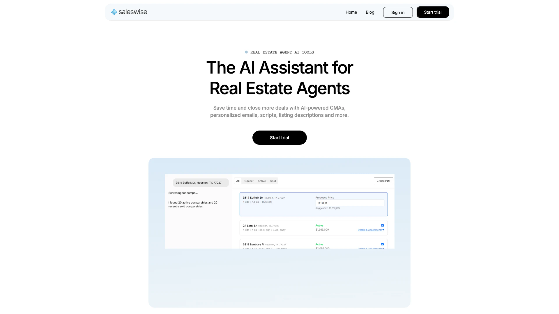 - 人工智能驱动的CMA生成: Saleswiseai可以在短短30秒内生成全面的市场分析(CMA)报告,为代理节省宝贵的时间。