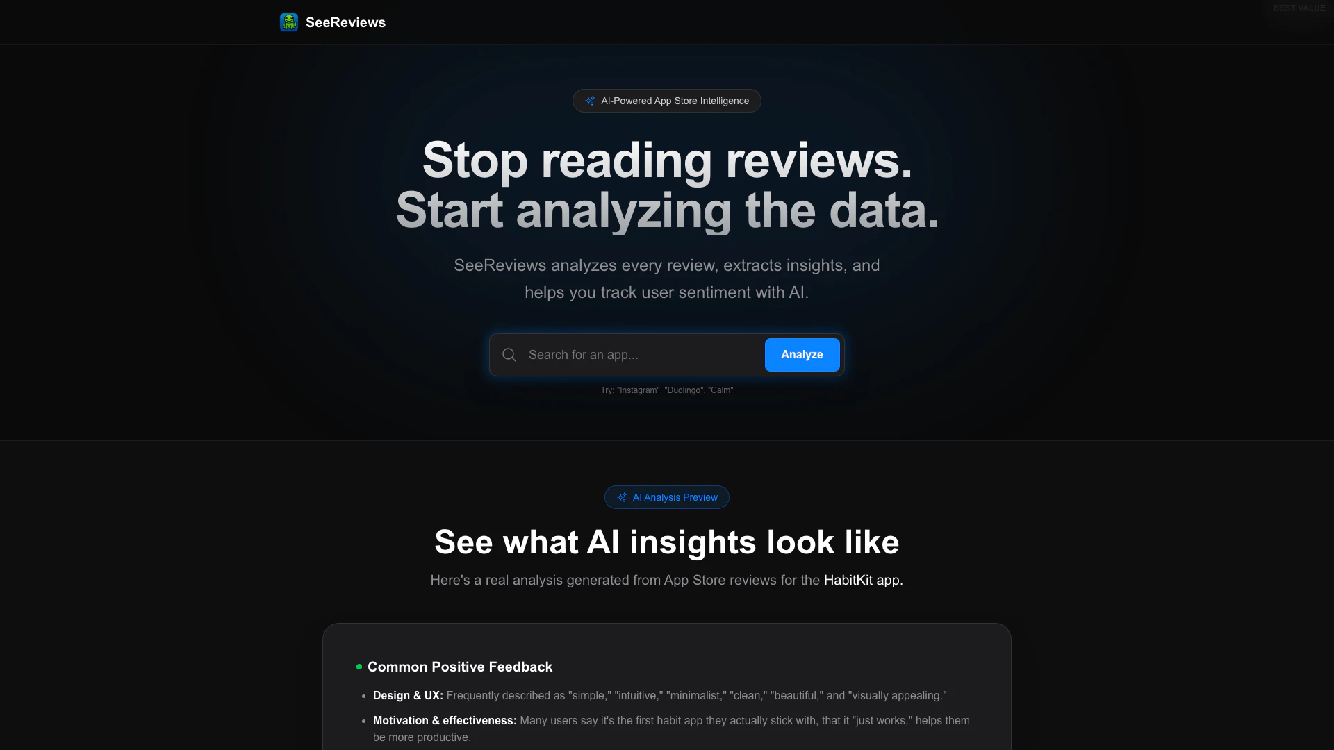 SeeReviews 专为独立开发者、ASO 专家和希望提升移动应用程序的产品团队量身定制。独立开发者可以获得用户偏好的见解,以提高用户留存率,而 ASO 专家可以提取有影响力的关键词来优化他们的 App Store 列表。产品团队则可以快速识别可用性问题和错误,从而最终改善产品开发和用户满意度。