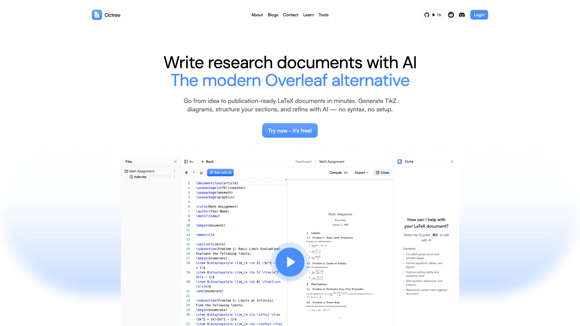 Useoctree是一个开源LaTeX编辑器,旨在简化学术写作过程,使其感觉自然且轻松。它结合了AI辅助功能,以提高写作速度和质量,使用户能够以最小的努力创建出版准备好的文档。通过实时协作和精美设计的模板等功能,Useoctree作为传统LaTeX编辑器(如Overleaf)的现代替代品,专门满足研究人员和学者的需求。