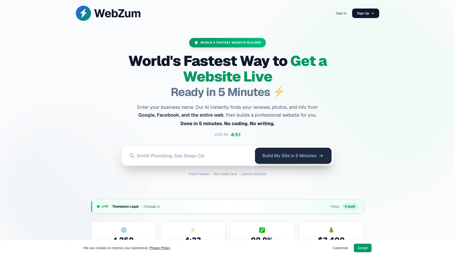 WebZum大约在5分钟内创建一个完整的专业网站。我们的AI自动从Google、Facebook、Yelp和整个网络中发现您的商业信息,然后为您生成所有内容、图像和设计。