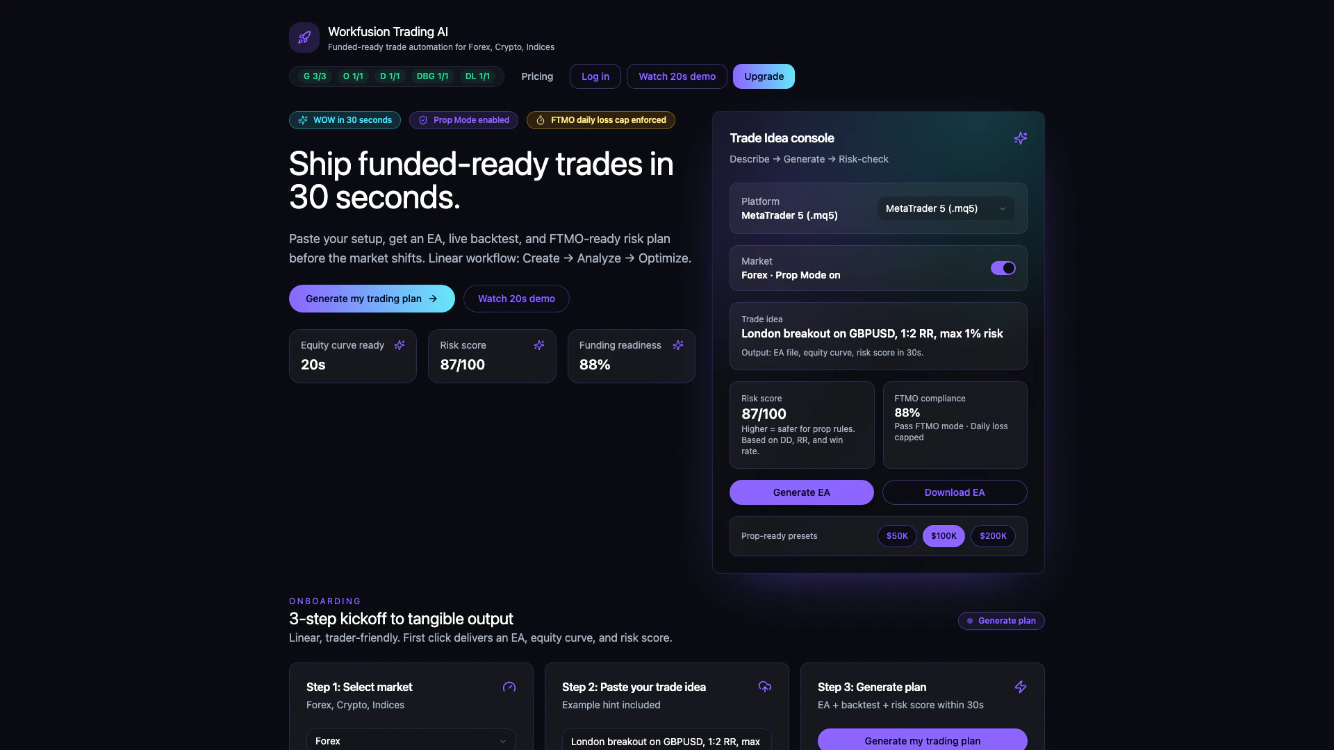 Workfusionapp是一个旨在为prop交易挑战生成、优化和修复MT4/MT5专家顾问(EAs)的工具,提供EA构建器、FTMO风险评分、优化器和EA调试器等功能。