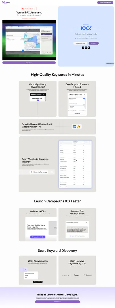 10xppc is an AI-powered PPC assistant designed to streamline and enhance the process of keyword research for digital marketing campaigns. By leveraging advanced algorithms, 10xppc automates the keyword discovery process, allowing users to generate high-quality, intent-driven keywords quickly and efficiently. The tool integrates seamlessly with Google Keyword Planner, making it an essential resource for marketers looking to optimize their PPC campaigns and improve their advertising effectiveness.