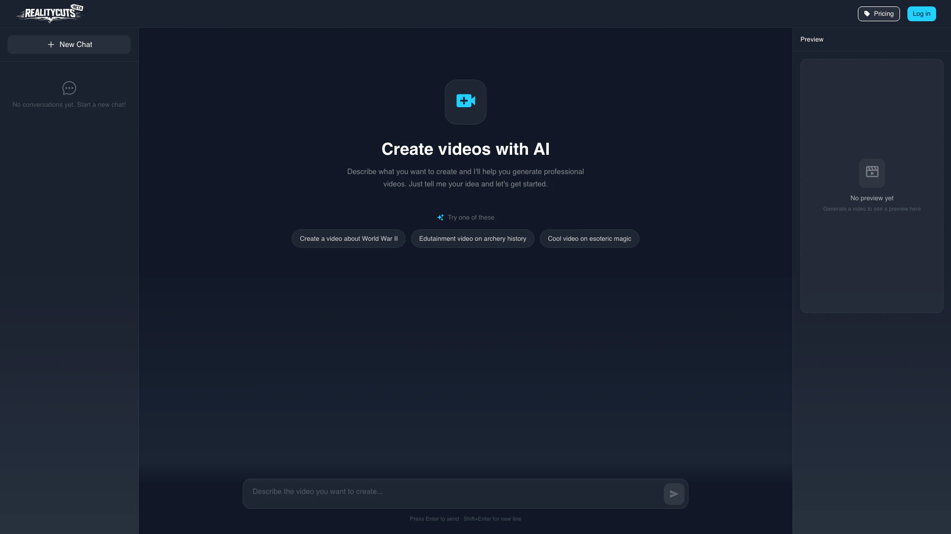 - Once logged in, describe your video idea in the provided input box. Be specific about the content and style you want.
