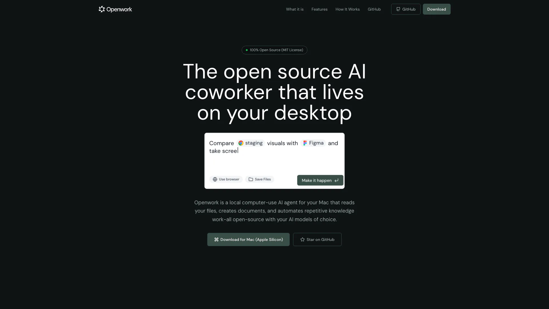 Accomplish, through its Openwork platform, is an open-source[1] AI agent[2] designed to enhance productivity[3] by automating repetitive knowledge work directly on your desktop. This powerful tool allows users to access their files, enabling the AI to organize, create, and edit documents while keeping all actions local. Unlike traditional cloud-based services, Openwork ensures that your files remain on your machine, providing you with complete control over your data. With the ability to integrate your preferred AI models, such as OpenAI or Anthropic, it serves as a versatile assistant for various tasks, making it an invaluable resource for users looking to streamline their workflow.