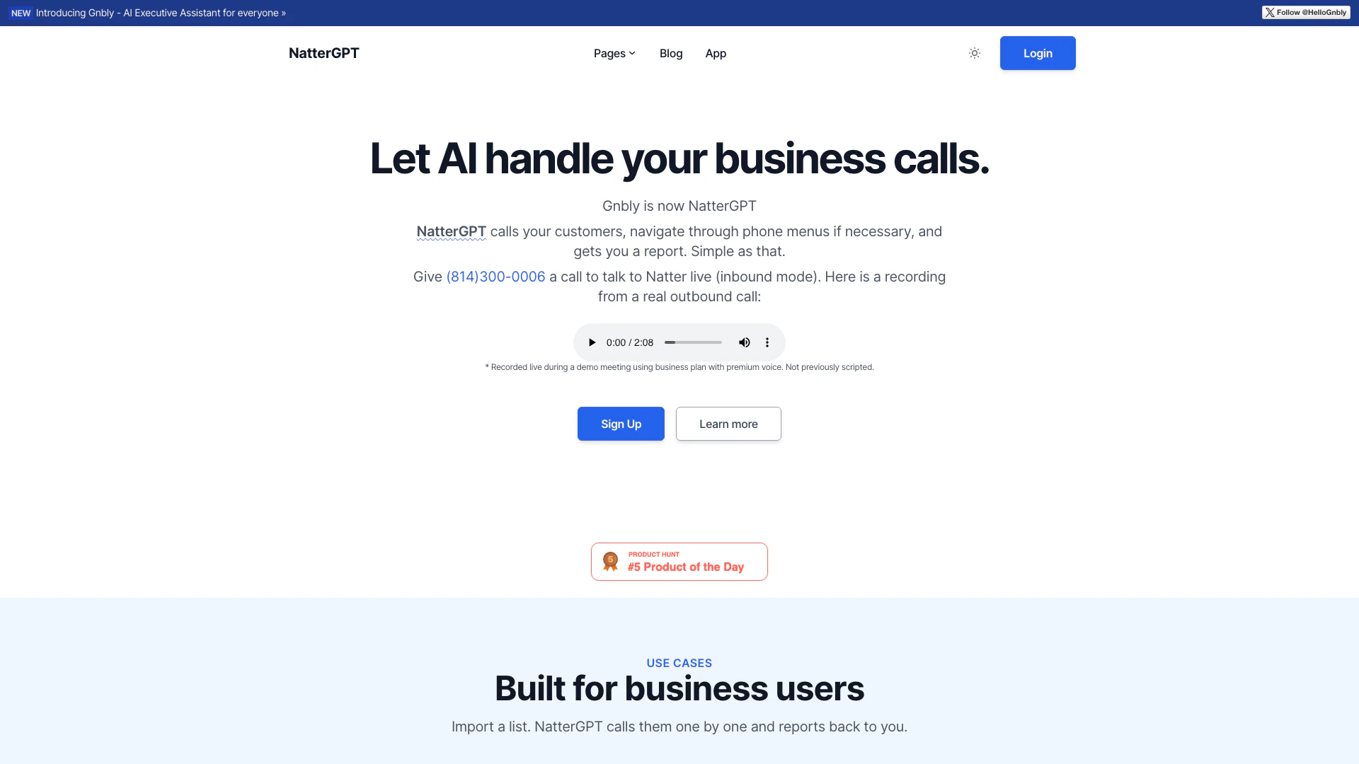 Everything in Pro Plan, Includes 100 hours of phone call, Let NatterGPT handle incoming calls, Let NatterGPT be sales/customer support during incoming calls, Lead qualification report for incoming calls, Email support - 1 business day turnaround, Phone support for emergencies - same day turnaround, Extra phone calls at $0.35/min.
