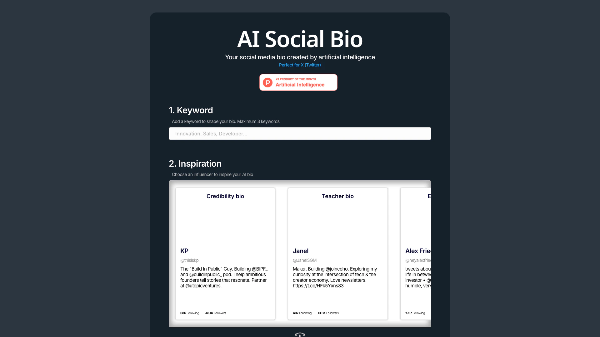 - Keyword Customization: Allows users to add up to 3 keywords to shape their bios, enhancing personalization.