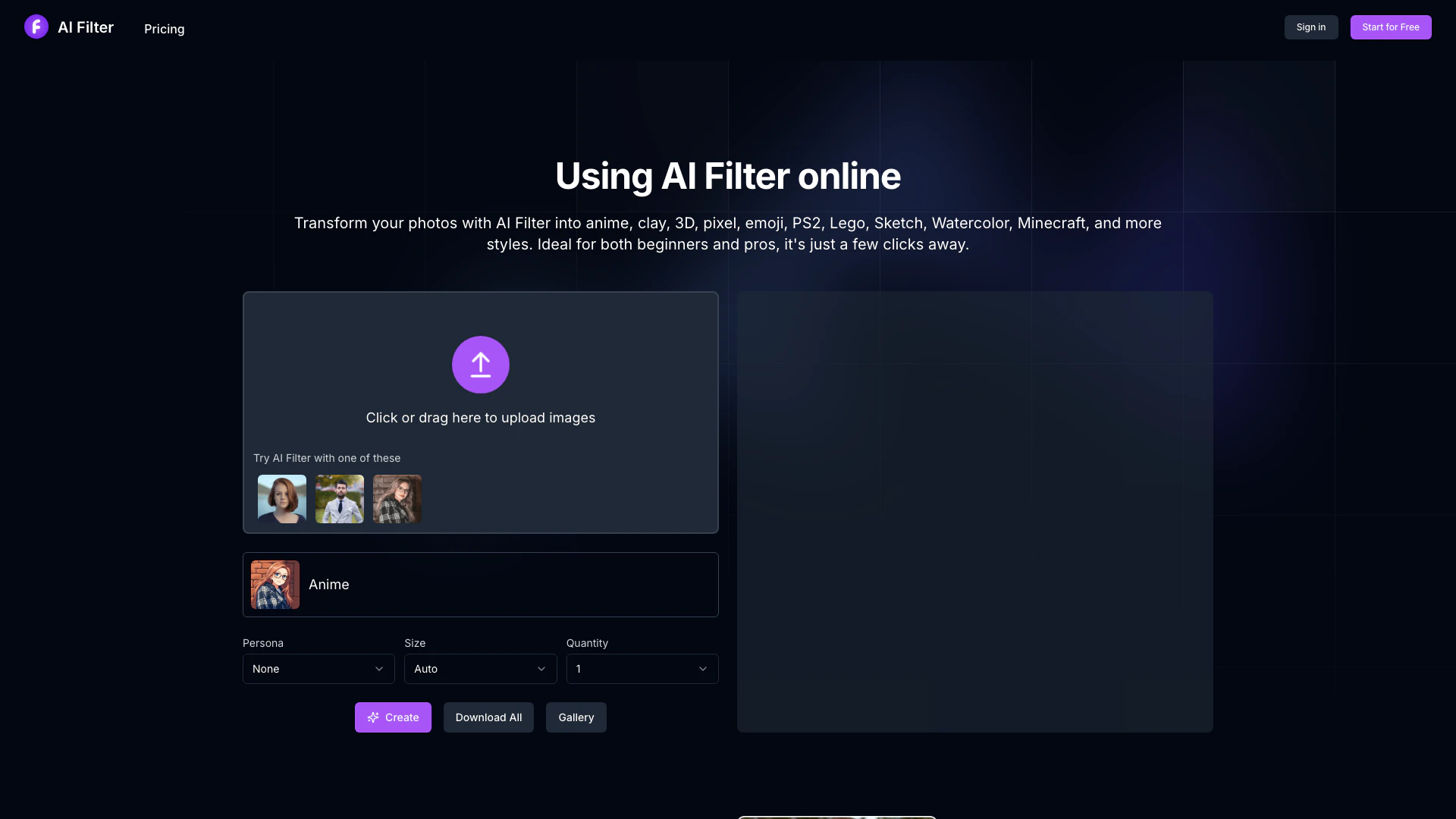 - Diverse Artistic Styles: Aifilter offers a wide range of styles, including anime, clay, 3D, pixel art, emojis, PS2 graphics, and stickers.