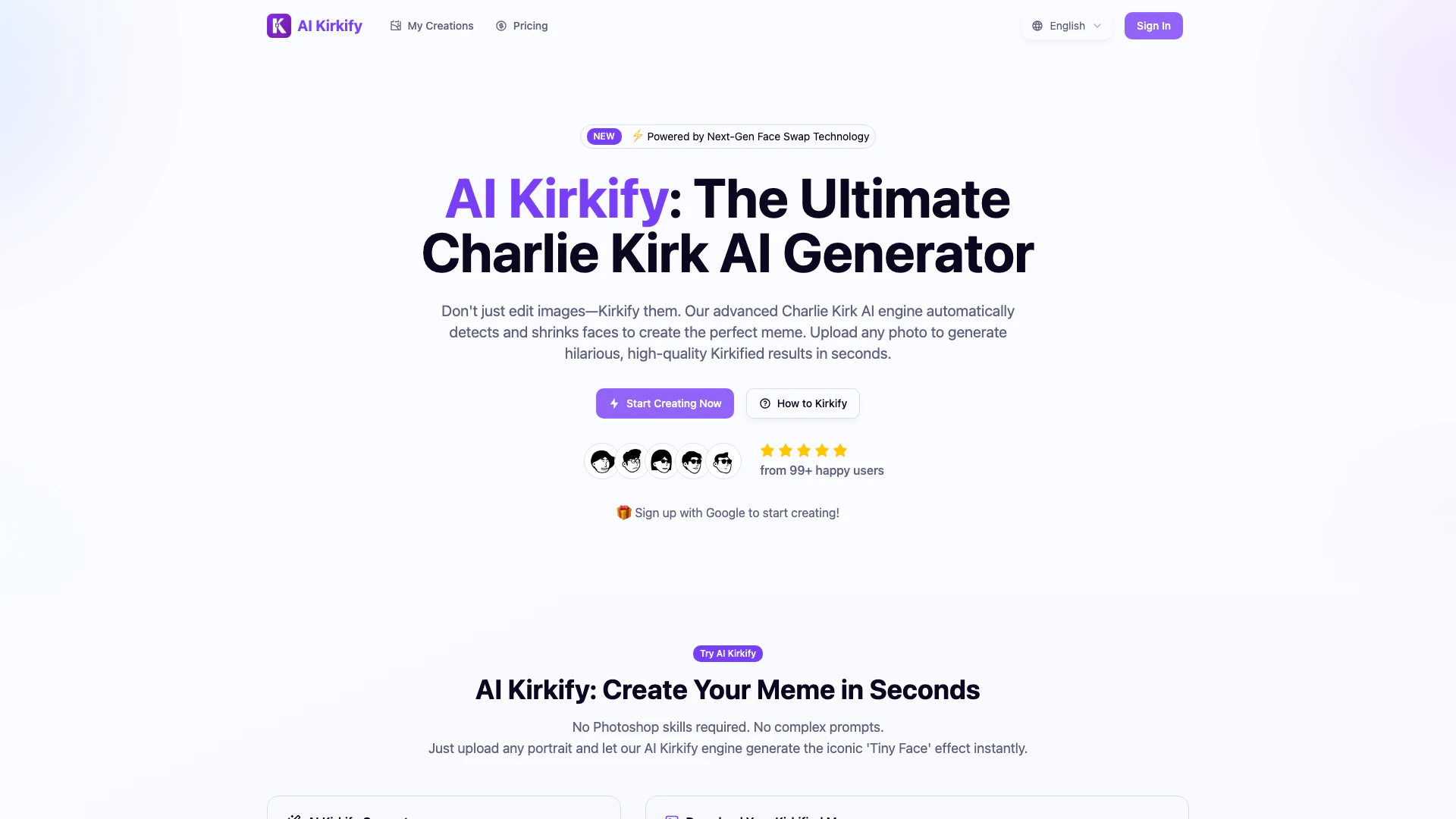 AI Kirkify is an innovative AI-powered tool designed specifically for creating humorous 'Kirkified' memes by applying a unique face swap[2] effect based on Charlie Kirk's likeness. This tool utilizes advanced algorithms to automatically detect and resize facial features, transforming any uploaded image into a funny meme in seconds. Unlike traditional photo editing software, AI Kirkify simplifies the process, allowing users to create high-quality, viral content without needing any graphic design skills. Its core value lies in its ability to deliver quick, realistic, and shareable meme results, making it a go-to solution for meme enthusiasts.