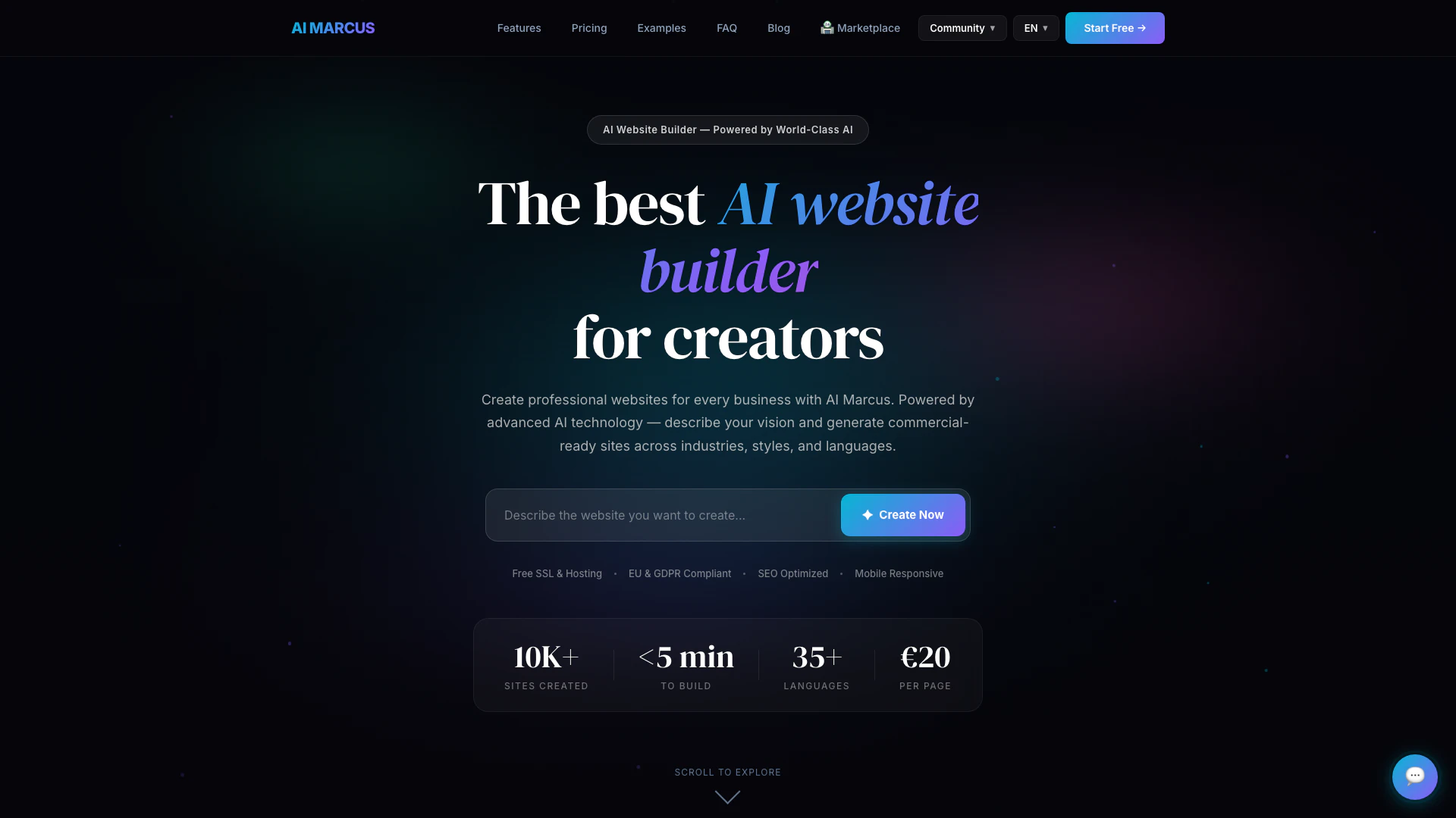 AI Marcus is an AI-powered website builder that creates complete, professional, multi-page websites in minutes. Just describe your business in a chat — AI generates design, content, images, and SEO optimization automatically.